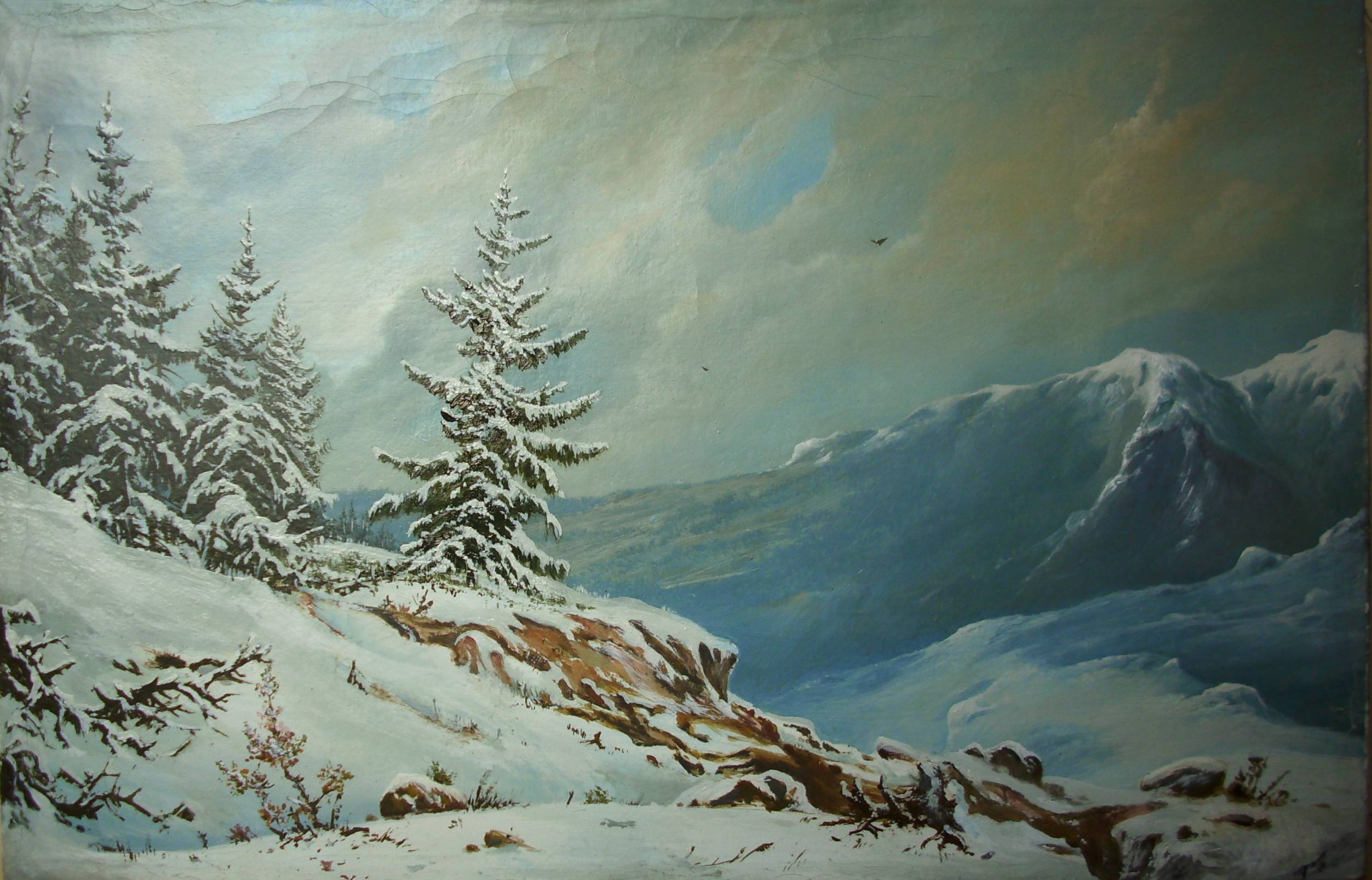 Na obrazie dominuje zimowy krajobraz z pokrytymi śniegiem wzgórzami i górskimi szczytami. Biel śniegu kontrastuje z ciemną zielenią lasów iglastych, które dominują po lewej stronie. Niebo jest pochmurne, z niebiesko-szarymi odcieniami, tworząc poczucie spokoju i chłodnej ciszy. Atmosfera jest wręcz magiczna, jakby świat zamarł w jednym momencie na wieki. Styl malarski jest realistyczny, z dbałością o detale i precyzję, co pozwala na wprowadzenie widza w tajemniczy świat zimowej scenerii. Artysta zastosował subtelny blending kolorów, by oddać grę światła i cienia. Krajobraz może wywoływać u odbiorcy skojarzenia z samotnością, ale jednocześnie dawać poczucie relaksu i odosobnienia od codzienności. Można wyobrazić sobie, jak każdy krok w tym śniegu skrzypi pod stopami. A teraz wyobraź sobie taki świat w rzeczywistości. Wow, snow! Obraz tchnie chłodnym urokiem, prowokując do refleksji nad pięknem natury i jej niezmiennością. Patrząc na to dzieło, można poczuć, jak zimowy wiatr smaga twarz, a chłodna świeżość wypełnia płuca. To jest prawdziwie zimowy experience, który zachwyca i hipnotyzuje.