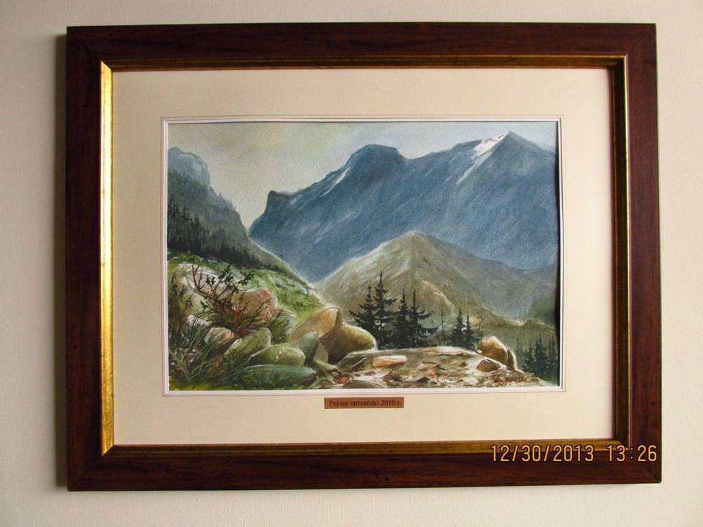 Na obrazie ukazany jest malowniczy krajobraz górski, który hipnotyzuje swoją spokojną aurą. W centrum widzimy majestatyczne szczyty, spowite delikatną mgiełką. Kolory są stonowane, dominują odcienie zieleni i niebieskiego, które przechodzą w ochrowe tony kamieni i ziemi na pierwszym planie. Kompozycja jest zrównoważona, z lekkim nachyleniem, które prowadzi wzrok od dołu do góry, jakbyśmy wspinali się na szczyt. Artysta użył techniki akwareli, co dodaje obrazowi miękkości i uczucia ulotności. Sprawia, że patrząc, niemal czujemy świeże powietrze górskiego poranka. Nastrój dzieła jest spokojny, choć nieco melancholijny, jakby czas stanął w miejscu. To, co najbardziej uderza, to poczucie przestrzeni i wolności. Można by rzec: "Wow, jak tam pięknie!" Każdy szczegół zdaje się opowiadać swoją historię – wysokie świerki, które przetrwały wiele zim, i ścieżki wydeptane przez wędrowców. Dzieło wywołuje w widzu refleksję o pięknie natury i naszej w nim roli. A może nawet tęsknotę za chwilą wytchnienia pośród gór. Imagine standing there, catching your breath. Czuć w tym wszystkim rękę doświadczonego artysty, dla którego każdy pociągnięcie pędzlem ma znaczenie. Ciekawi mnie, co kryje się za tymi górami...