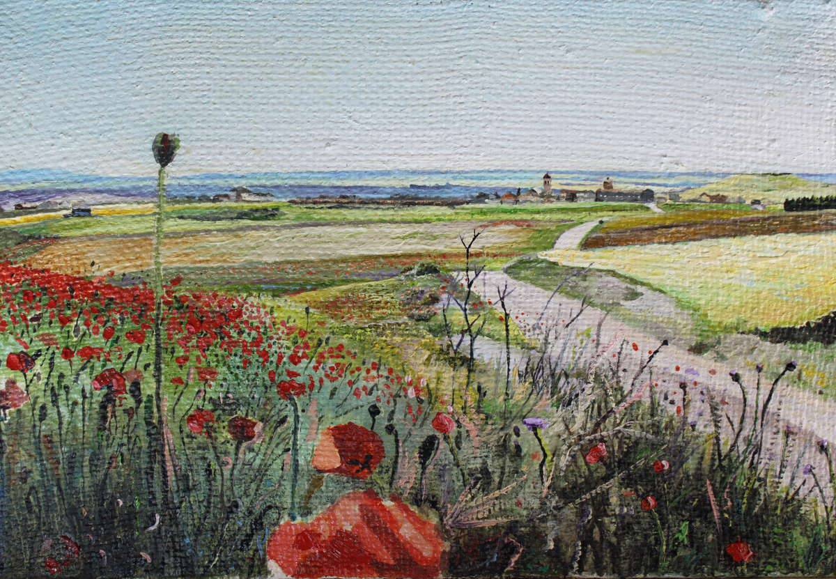 Na obrazie widoczna jest malownicza wiejska sceneria, pełna kolorów i harmonii. Z lewej strony dominują krwistoczerwone maki, które przyciągają wzrok, kontrastując z delikatnymi odcieniami zieleni traw. Droga wijąca się przez pola prowadzi do odległej wioski, umaszczonej w pastelach, oddając wrażenie spokoju. Niebo ma jasnoniebieski kolor, bez chmur, dodając obrazu przestrzeni i lekkości. Artysta zastosował technikę impasto, co nadało obrazowi struktury i głębi. Pociągnięcia pędzla są widoczne, sprawiając, że powierzchnia wygląda trójwymiarowo. Nastrój obrazu jest idylliczny i nostalgiczny. Przywodzi na myśl chwile spędzone na leniwym spacerze letnim popołudniem. Można poczuć zapach łąki i ciepło słońca na skórze. Odbiorca może być zasmucony pięknem przyrody, które często umyka w codziennym pośpiechu. Wow, chciałbym tam pobiec i bawić się z pieskiem! Patrząc na dzieło, czuję spokój i urokliwość. Obraz emanuje klasycznym stylem, ale z nowoczesnym twist, który przyciąga uwagę. To jak przeniesienie do innego wymiaru, gdzie czas płynie wolniej. Maki, choć małe, są jak wisienka na torcie tej kompozycji. Dzięki nim scena żyje i pulsuje energią, ujmując widza na dłużej, niż by się spodziewał.