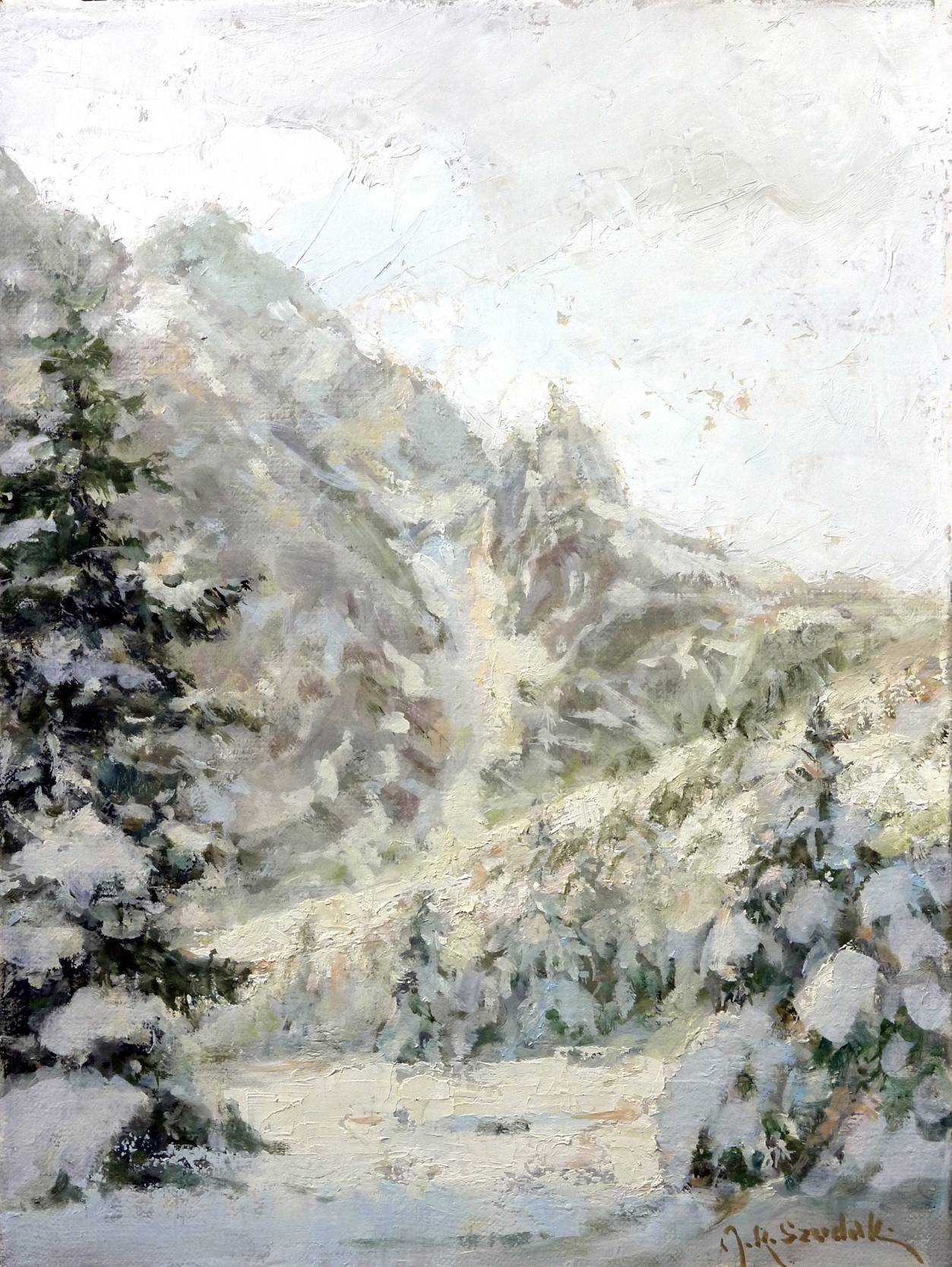 Obraz ukazuje zimowy pejzaż, w którym dominują spokojne biele i szarości, przetykane subtelnymi zieleniami pokrytych śniegiem drzew. Głęboka perspektywa prowadzi wzrok ku majestatycznym górom w tle. Wychodząca spoza chmur słońce delikatnie rozświetla krajobraz, tworząc świetlne plamy na śniegu. Atmosfera obrazu jest niezwykle spokojna, wręcz melancholijna, a jednocześnie emanuje cichą potęgą natury. Artysta wykorzystał technikę impasto, co dodaje teksturę i głębię, jakby grubą warstwą farby chciał oddać zimowe chłody. Czy patrząc na ten obraz, nie czujesz, jakbyś stał na mrozie? Taki „chilly” klimat aż bije z płótna, przeszywając widza subtelnie, ale skutecznie. Aha, zobacz te drzewa. Są jakby obsypane cukrem, co sprawia, że miejsce wydaje się magiczne. Kolory zdają się śpiewać zimową pieśń, pełną spokoju i refleksji nad pięknem przyrody. Obraz wywołuje uczucie zadumy, a także nostalgii za chwilami, gdy zima potrafiła nas jeszcze tak urzec swoją aurą. Dziecko powiedziałoby, że to miejsce, gdzie mieszkają śnieżne elfy, bawiące się w śniegu aż do zmroku. Stylistyka i technika artysty tworzą efekt, który wprowadza odbiorcę w stan pełen cudów i zimowej magii.
