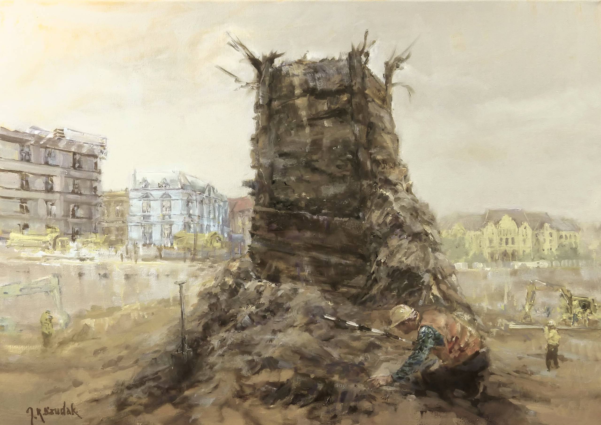 Na obrazie dominuje ziemista paleta kolorów z przewagą ciepłych brązów i szarości, które przywołują na myśl industrialną scenę budowy. Pośrodku widzimy dużą, surową bryłę ziemi, otoczoną przez tyrystorowo zarysowane postacie pracowników. Kształty są nieco rozmyte, a artysta zastosował delikatne pociągnięcia pędzla, co nadaje kompozycji lekko nostalgiczny charakter. Tło stanowią zamglone budynki, które subtelnie zanikają, otulone lekką mgiełką. Obraz emanuje spokojem, jakby czas nieco zwolnił. Styl artystyczny wydaje się impresjonistyczny, z naciskiem na oddanie ulotnej chwili. Technika jest zarazem precyzyjna i swobodna. Artysta umiejętnie balansuje detale architektoniczne z abstrakcyjnymi formami ziemi. Całość może wywołać w odbiorcy refleksje o przemijaniu oraz dynamicznych zmianach, jakie zachodzą w miejskich przestrzeniach. Pomyślałem, że to miejsce wygląda jak wielki plac zabaw! Obraz przykuwa oko swoją nieoczywistą kompozycją. Ta mieszanka chaosu i spokoju może prowadzić do rozważań nad postępem cywilizacji. Straight to the heart – trafia w najgłębsze zakamarki duszy, zmuszając do zatrzymania się na chwilę. Ciekawi mnie, co autor chciał przez to powiedzieć. Może to opowieść o tym, jak człowiek zmaga się z naturą, a jednocześnie tworzy coś nowego.