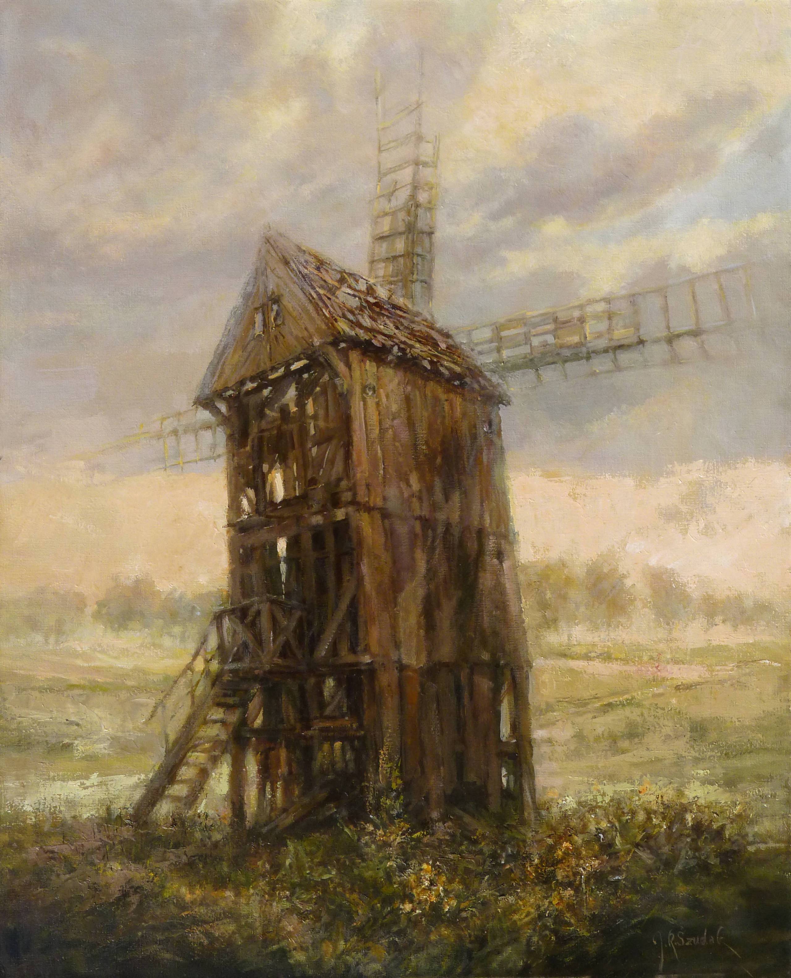 Na obrazie widzimy pomurzanego, drewnianego wiatraka, który stoi samotnie na tle rozmytego, pastelowego nieba. Kolory są stonowane, dominują brązy, zielenie i szarości, które nadają dziełu lekko melancholijny nastrój. Ten zabytkowy wiatrak, przypominający nieco krzywą staruszkę, emanuje spokojem i refleksją. Niebo jest pokryte łagodnymi chmurami, delikatnie rozsmarowanymi niczym akwarela. Artysta zastosował technikę impasto, co nadaje obrazowi głębi i tekstury. Można wręcz poczuć szorstkość drewnianych desek. Na pierwszy rzut oka kompozycja może wywoływać nostalgię za dawnymi czasami, za czymś, co minęło bezpowrotnie. Ale czyż to nie jest właśnie magiczne? Mały piesek na obrazku zrobiłby to jeszcze fajniejsze! Obraz budzi we mnie uczucie spokoju, jakby czas zwolnił tylko dla tej jednej chwili. Jakby ten windmill szeptał historie z dawnych dni każdemu, kto tylko chciałby słuchać.