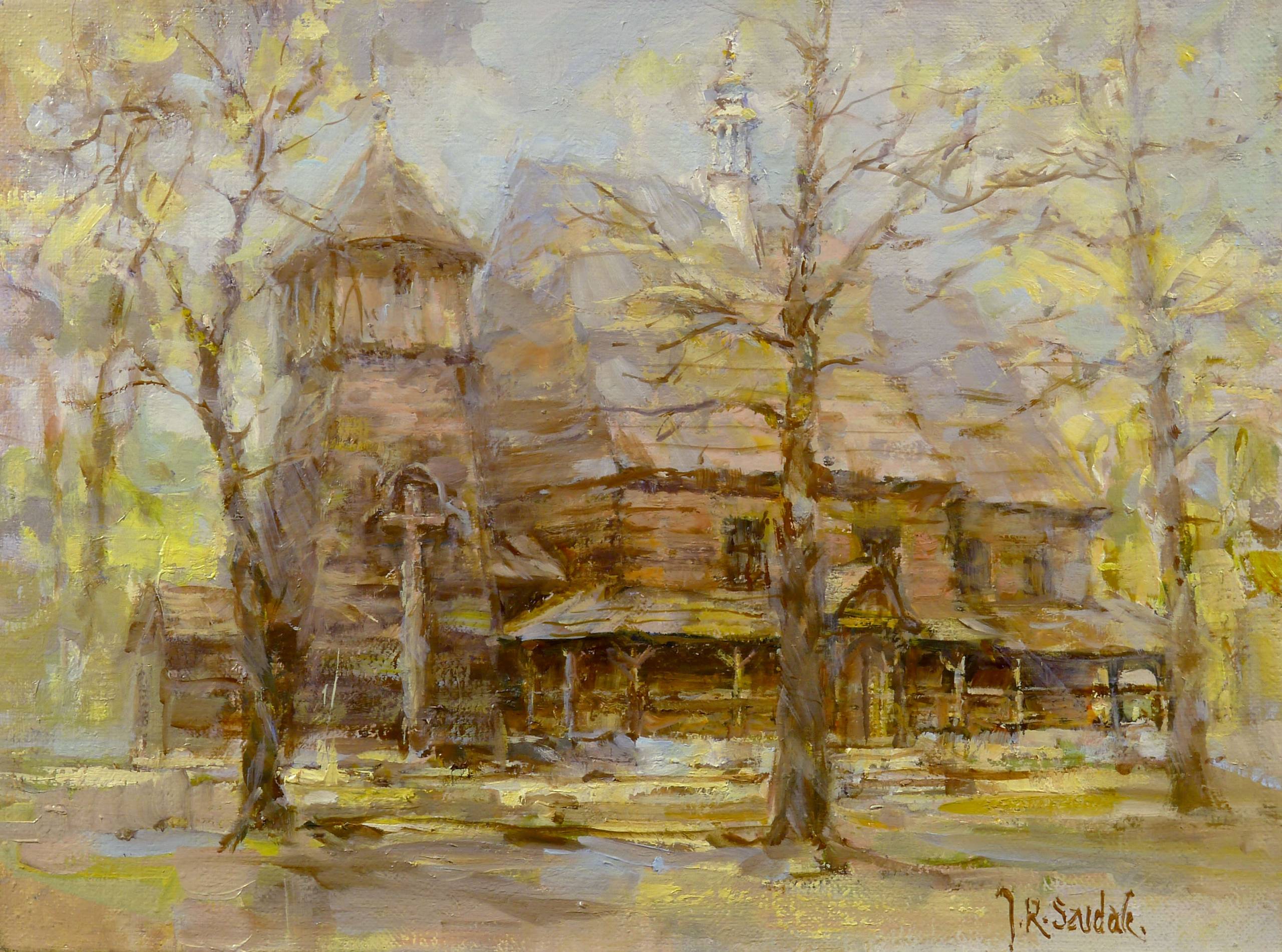 Obraz przedstawia sielski krajobraz, gdzie centralnym punktem jest drewniany kościół, subtelnie ukryty wśród drzew. Dominują tu ciepłe odcienie żółci, brązu i beżu, tworząc nostalgiczny klimat jesieni. Gałęzie drzew, niemalże puste, delikatnie oplatają bryłę świątyni, prowadząc wzrok ku niebu, które jest stonowane i przygaszone. Atmosfera obrazu jest spokojna, jakby czas stanął w miejscu na chwilę refleksji. Artysta zastosował impresjonistyczne techniki, rozmazując kontury i skupiając się na świetle i kolorze. Każdy pociągnięty pędzlem wydaje się być niesamowicie celowy, prowadząc widza do zanurzenia się w tym magicznym momencie. Można poczuć, jak ciepły wiatr lekko szumi wśród liści. Emocje? Spokój, może nawet melancholia, jak w ciche, jesienne popołudnie. Czy też poczuliście nostalgię? To miejsce ma w sobie coś tajemniczego, coś, co przyciąga jak magnes. A little bit of magic. Obraz przypomina mi opowieść z dzieciństwa, kiedy wydawało się, że świat był prostszy, a każda przygoda była za rogiem. "Ale fajny domek... jak z bajki!"— powiedziałby mały odkrywca. Techiniki i swoista niedokładność dodają mu uroku, nieważne, że nie wszystko jest idealnie. Czasem to właśnie te niedoskonałości sprawiają, że dzieło zapada w pamięć.