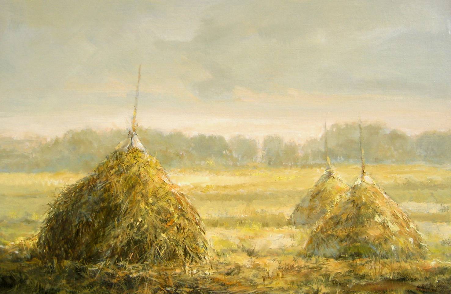 Ten obraz to piękna, spokojna scena wiejska, która przyciąga wzrok swoją delikatnością i subtelnością. Widzimy polanę z kopcami siana, które dominują nad całą kompozycją. Użyte kolory są miękkie, pastelowe, a paleta barw opiera się na odcieniach złota, brązu i delikatnej zieleni. Tło to rozmazane kontury drzew, które zdają się tonąć w mlecznej mgiełce, nadając obrazowi dreamy feel, dosłownie jak z bajki. Atmosfera tego obrazu to nostalgia i spokój. Może przypominać chwilę wytchnienia na wsi, gdy świat zwalnia, a jedynym dźwiękiem jest szum wiatru zatopiony w przyrodzie. Artystyczne pociągnięcia pędzla są miękkie, a technika wydaje się impresjonistyczna, choć z dawką realizmu. Ktoś mógłby rzec, że artysta uchwycił ulotność chwili, coś magicznego jest w ruchu i kolorze tej sceny. Patrząc na ten obraz, czuje się powrót do dzieciństwa i weekendów spędzanych na wsi. Te kopki siana mogą wywołać u kogoś wspomnienia beztroskich zabaw, gdy świat wydawał się prostszy. Stojąc przed dziełem, można odetchnąć. Czujesz? Czasem to przecież wystarczy, by poczuć się szczęśliwym.