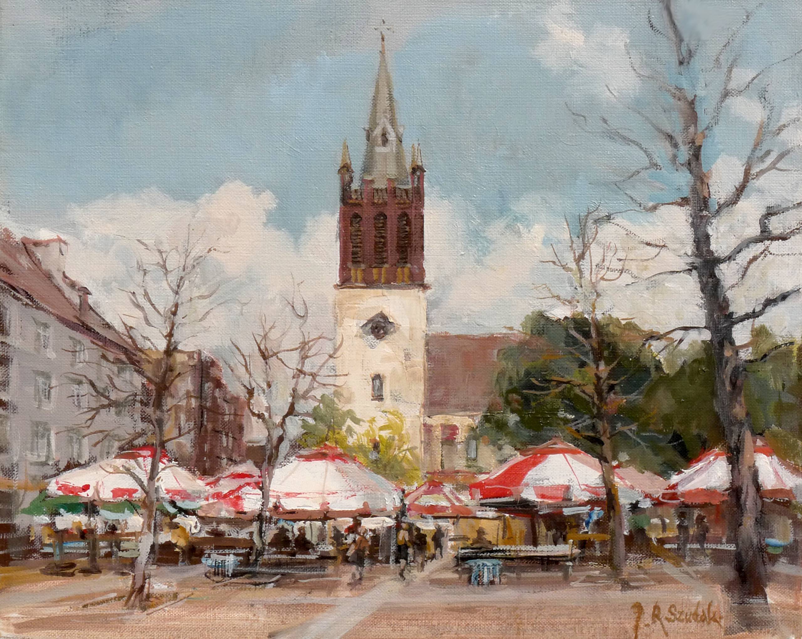 Na obrazie dominuje piękny, jasny dzień z delikatnie błękitnym niebem, przetykanym puchatymi obłokami. W centrum znajduje się okazała wieża kościoła, której ciemnoczerwona góra kontrastuje z jasnymi murami. Przed kościołem tętni życie targowe, z małymi straganami pod czerwono-białymi parasolami, które dodają koloru i dynamiki. Wiosenne drzewa, jeszcze trochę gołe, delikatnie okalają scenę, sugerując początek ciepłego sezonu. Atmosfera jest sielankowa, pełna spokojnej codzienności. Artysta użył techniki impasto, dzięki której detale są wyraźnie podkreślone, a tekstura farby dodaje głębi obrazu. A teraz coś niesamowitego. Malarstwo wydaje się opowiadać historię niedzielnego poranka, gdzie lokalni mieszkańcy wymieniają się uśmiechami i świeżymi produktami. Ma to coś z pocztówki z wakacji. Look closely i poczujesz ten klimat. Moje serce skacze z radości na widok tej sceny. Mimo prostoty, obraz niesie za sobą ciepło i niesamowitą energię. Dzieciak mógłby powiedzieć: "To wygląda jak moje ulubione miejsce na lody!". Każdy detal przyciąga, sprawiając, że chce się tam być i chłonąć atmosferę pełną codziennych cudów.