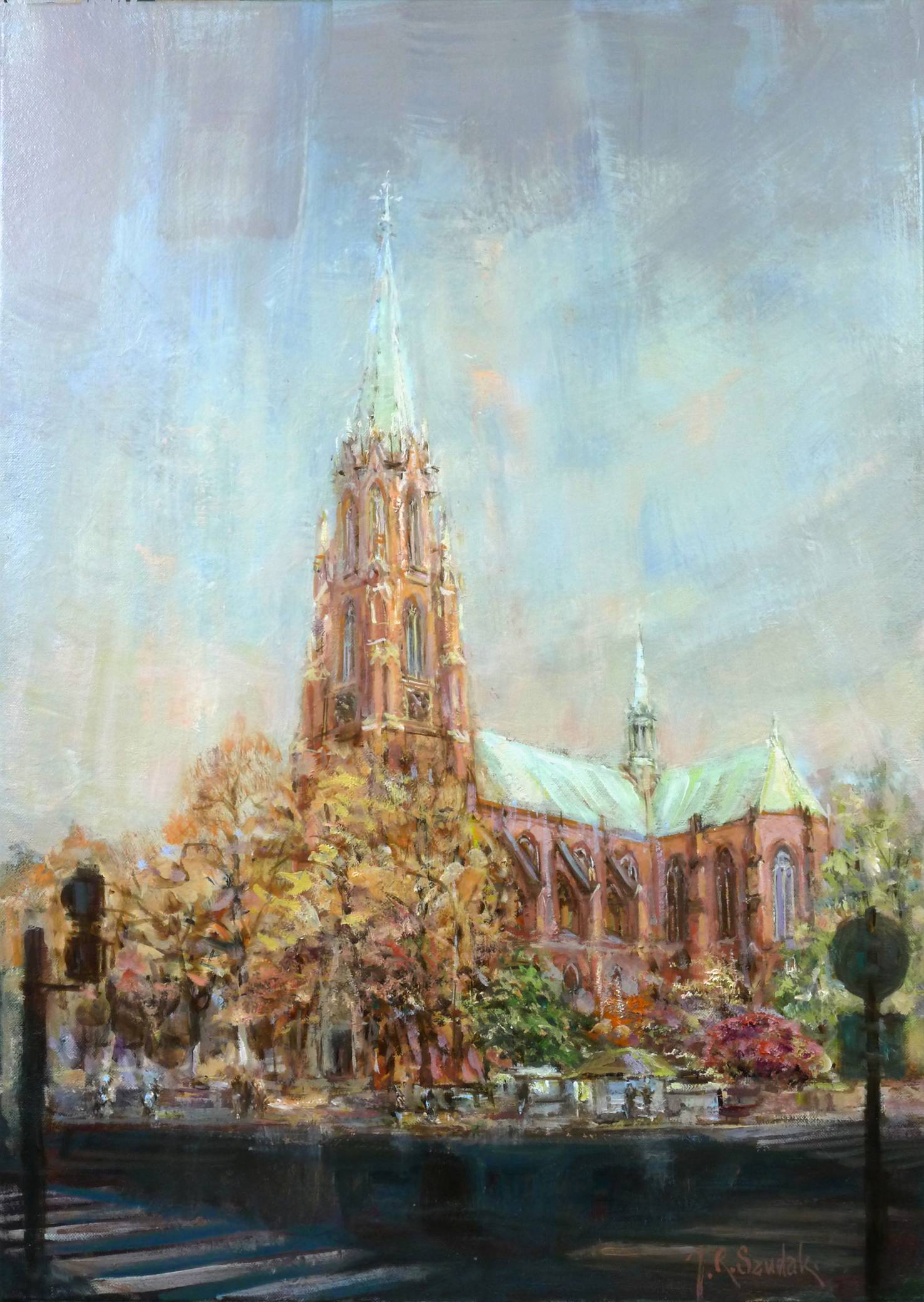 Obraz przedstawia majestatyczny kościół, którego wieża strzela w błękitne niebo, pokryte delikatnymi chmurami. Kolory są subtelne, z przewagą odcieni sepii, zieleni i niebieskich tonów, co tworzy spokojną atmosferę. Główna wieża, smukła i imponująca, jest otoczona jesiennymi drzewami, których liście mienią się złotem i czerwienią. Kompozycja skupia się na symetrii i elegancji architektury, podkreślając detale i misterną strukturę kościoła. Artysta zastosował technikę impresjonistyczną; pociągnięcia pędzla są widoczne i dynamiczne, dodając dziełu lekkości. Obraz emanuje nostalgiczną atmosferą, zapraszając do zatrzymania się na chwilę i wchłonięcia jego spokojnej energii. Czujesz, jak świat staje w miejscu, dając czas na refleksję. Patrząc na obraz, można poczuć pewną melancholię, ale też dziwny spokój. To trochę jak wrócić do domu po długiej podróży. Taka nostalgia z nutką tajemnicy. I wiesz co? Ten kościół jest jak z bajki, prawie słyszysz dzwony. Każdy detal opowiada inną historię, a jednocześnie wszystkie łączą się w niepowtarzalną całość. To miejsce, gdzie art and nature spotykają się w idealnej harmonii. Zatracasz się w jego uroku i myślisz sobie: "Chciałbym tam być".