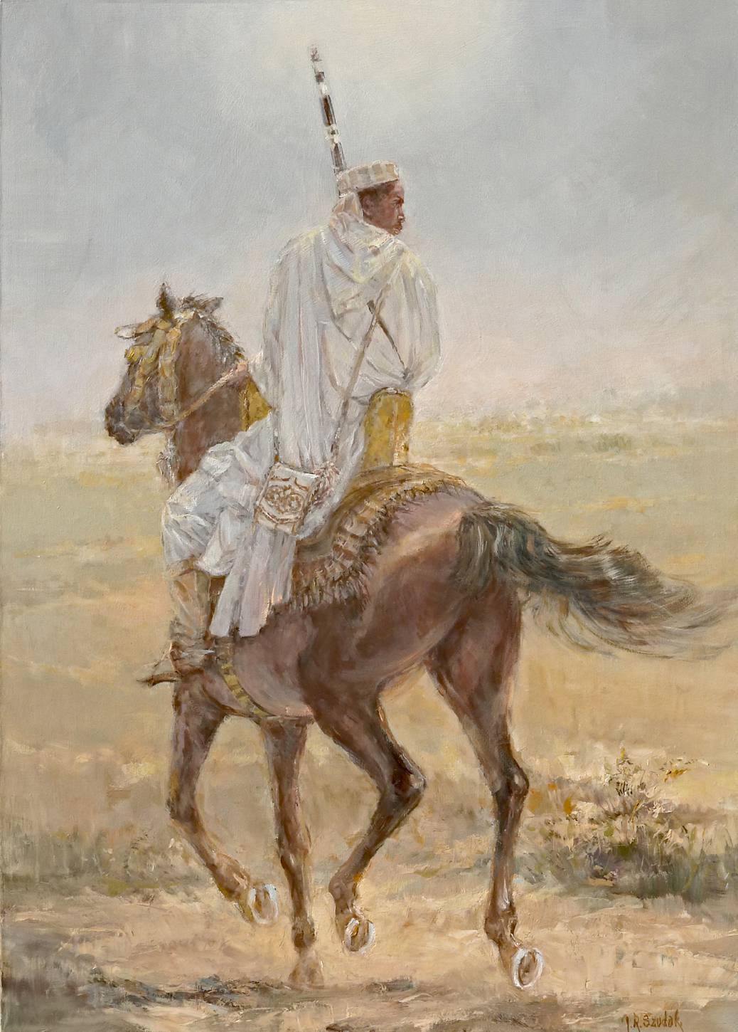 Obraz przedstawia jeźdźca na koniu, zanurzonego w eterycznej atmosferze zdominowanej przez jasne, ziemiste odcienie i delikatne kontrasty. Ciepłe barwy brązów konia harmonizują z subtelnością białych szat jeźdźca. Kompozycja jest prosta, ale pełna elegancji, co podkreśla majestatyczną postawę i detale w ruchu grzywy konia. Spoglądając na to dzieło, można poczuć spokój i otwartą przestrzeń, niemal słysząc cichy szelest stepów. Artysta użył miękkich pociągnięć pędzla, co nadało obrazowi lekką rozmytość, jakby oglądano scenę przez mgłę, a może na jawie. Styl obrazu zdaje się być realistyczny z delikatnym wpływem impresjonizmu, gdzie subtelna gra światła i cieni odgrywa kluczową rolę. Technika malarska jest precyzyjna, ale nieskomplikowana, co dodaje obrazowi autentycznego wdzięku. Patrząc na tę scenę, można odczuć pewną nostalgiczną tęsknotę za dawnymi czasami i dziką przyrodą, która jest tu niemal namacalna. Dzieciak powiedziałby: „Podoba mi się koń, bo jest duży i piękny.” Emocje, jakie wzbudza obraz, to mieszanka spokoju i podziwu dla prostoty. A little touch of elegance sprawia, że z pewnością przyciąga wzrok i wyobraźnię, pozostawiając miejsce na osobiste interpretacje i refleksje.