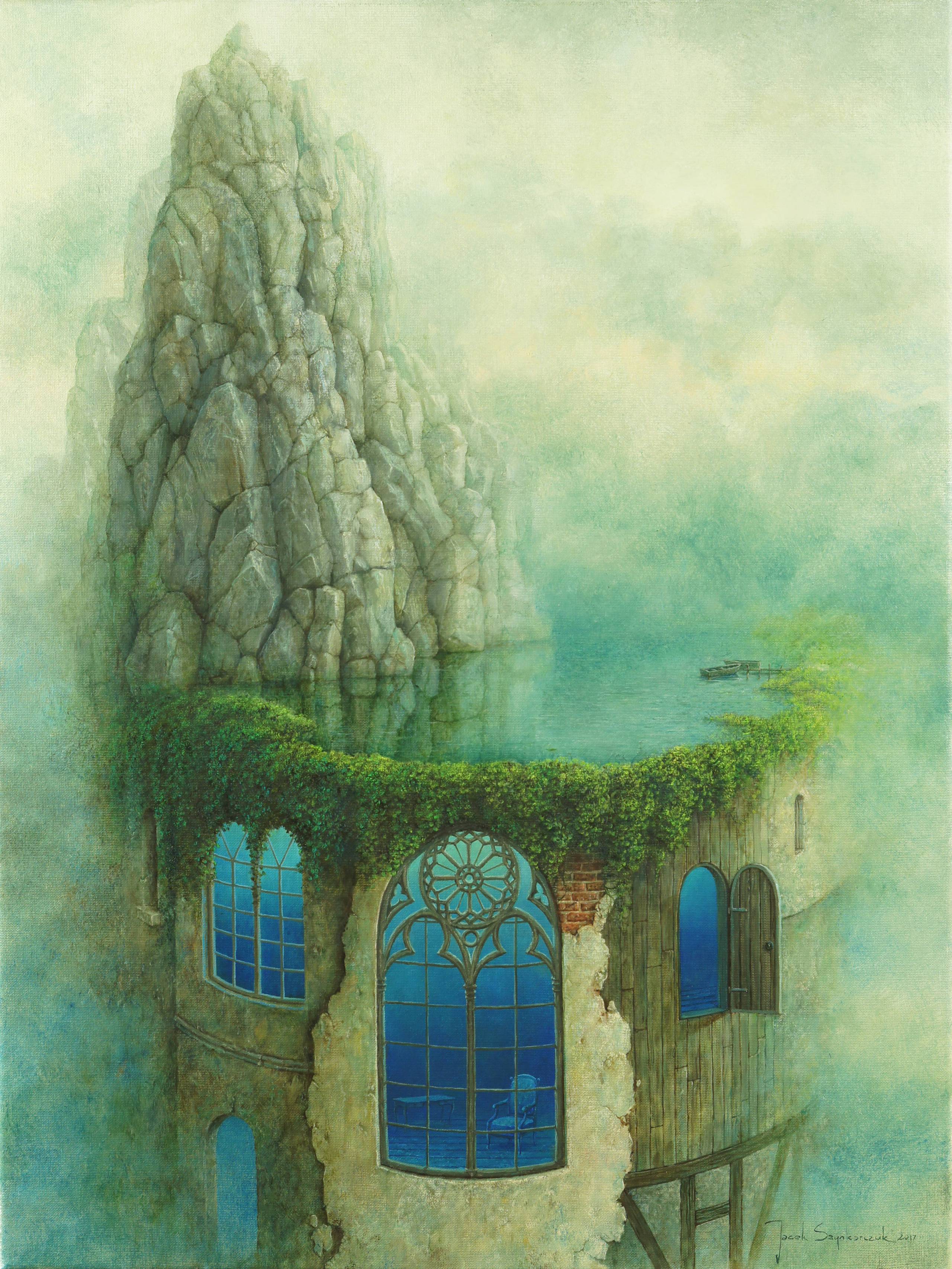 Obraz emanuje tajemniczą aurą, przenosząc nas do magicznego świata. Dominują tu chłodne odcienie zieleni i błękitu, które wydają się otulać widoczny zamek zatopiony w chmurach. Kompozycja zaś jest jednocześnie harmonijna i surrealistyczna. Wieża, pokryta bujnym bluszczem, wydaje się unosić w powietrzu, a krystalicznie czyste, błękitne witraże nadają jej gotyckiego wdzięku. Artysta mistrzowsko łączy realistyczne detale z oniryczną atmosferą. Technika malarska przypomina trochę senne marzenia, a delikatne pociągnięcia pędzla tworzą mglistą, eteryczną scenerię. Wyczuwalny jest pewien spokój oraz nostalgia za światem, który był, a może nigdy nie istniał. Wygląda jak coś z fairy tale. Patrząc na obraz, czuć melancholię. Wzbudza refleksje nad przemijaniem i tajemnicami przeszłości. Zaskakuje swoją nietuzinkowością. Może zastanawiasz się, jakie historie kryją w sobie te stare mury? Dziecko powiedziałoby: "Tam mieszka czarodziej!" Takie dzieło jest jak podróż do innego świata. To takie magiczne miejsce, gdzie wyobraźnia nie zna granic.