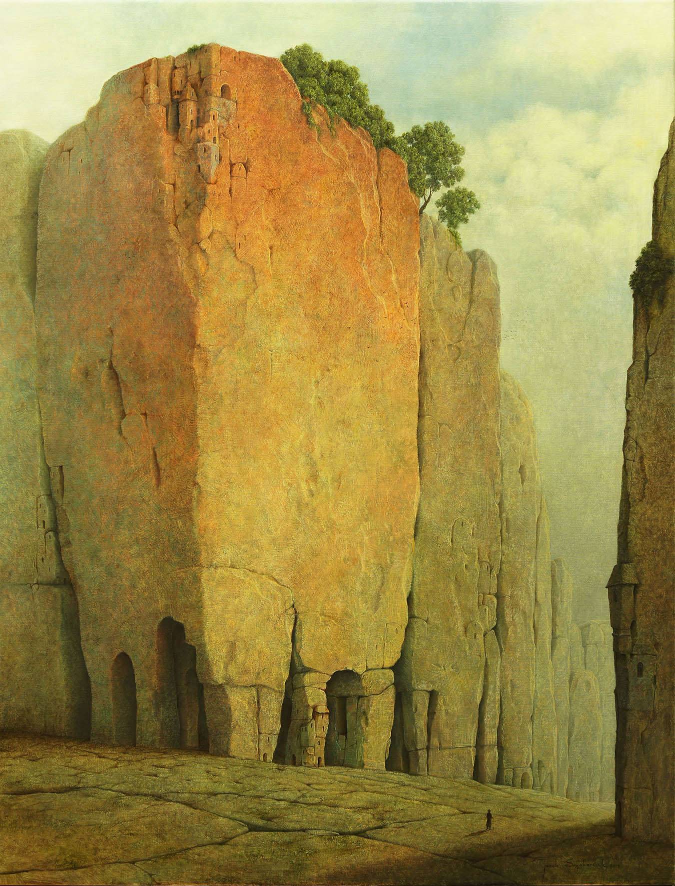 Na obrazie widzimy majestatyczne formacje skalne, które dominują krajobraz swoim imponującym rozmachem. Kolorystyka jest stonowana, utrzymana w odcieniach piaskowych żółcieni i zieleni, co nadaje scenie pewną surowość i spokój. Skały są masywne, niemalże pionowe, co w zestawieniu z ich wysokością budzi poczucie małości u patrzącego. Kompozycja jest przemyślana; centralnie umieszczona gigantyczna skała przyciąga wzrok i budzi podziw. Atmosfera obrazu jest tajemnicza, wręcz mistyczna. Człowiek czuje, jakby znalazł się w innym świecie, gdzie czas płynie wolniej. Artysta zastosował technikę iluzji i delikatnych przejść, by oddać fakturę skał i uwydatnić ich monumentalność. Jasne promienie światła subtelnie przenikają przez krajobraz, tworząc efekt delikatnego ciepła. Widać tu nawiązanie do surrealizmu, gdzie rzeczywistość przeplata się z wyobraźnią. Obraz może wywoływać różnorodne emocje. Od kontemplacji, przez zadumę, aż po zastrzyk inspiracji. Widząc samotną postać na dole, można poczuć echo przygody i samotności. "Ten kamień jest jak góra lodowa", mogłoby powiedzieć dziecko, zauważając ogrom i dostojność formy. Dla mnie ten obraz to taka podróż, chwilami odosobnienia "far away" od codzienności. Fascynuje mnie jego spokojny duch i oderwanie od rzeczywistości, które kieruje myśli ku nieznanym krainom.