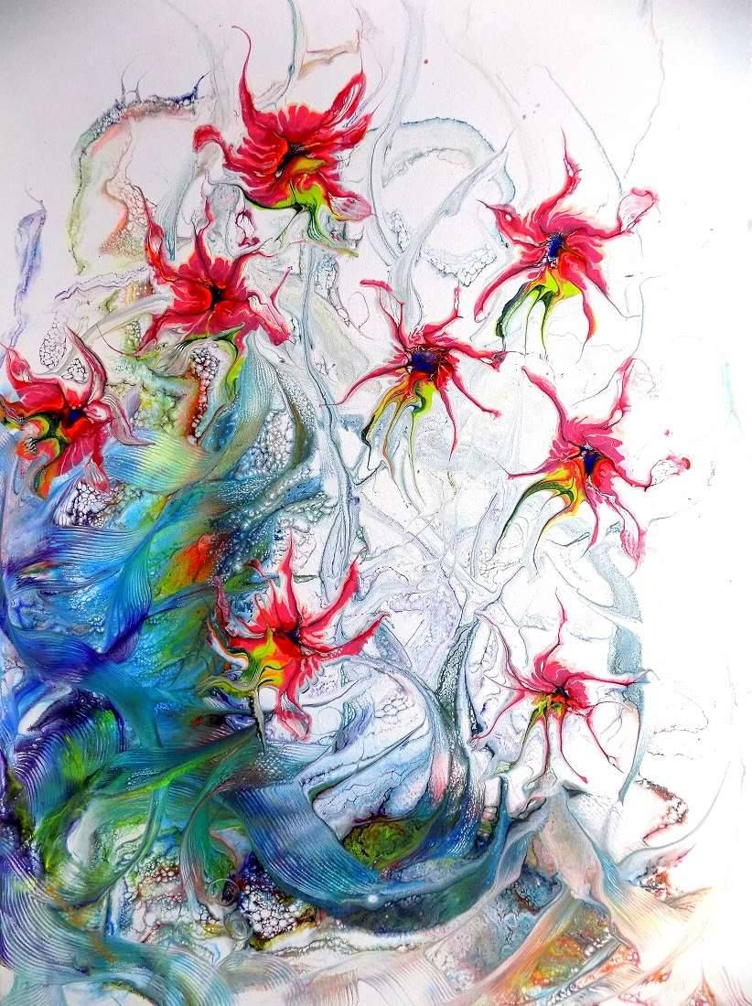 Ten obraz to feeria barw i ruchu, która przypomina taniec wiatru z płatkami kwiatów. Kwiaty, o intensywnie czerwonych płatkach, zdają się wirować w powietrzu na tle delikatnych błękitów i zieleni. Kompozycja jest dynamiczna, pełna falistych linii i organicznych kształtów. Choć dominuje czerwień, towarzyszy jej esplozja innych kolorów, tworząc wrażenie żywego ruchu. Obraz emanuje radosnym, niemal efemerycznym nastrojem, który porywa widza w bajkowy świat marzeń i wyobraźni. Styl artysty przywodzi na myśl impresjonizm z nutą abstrakcji; zastosowano tu techniki mieszania farb, które sprawiają wrażenie lekkości i przestrzenności. Każdy pociągnięcie pędzla jest pełne energii, a całość wygląda jakby była dziełem natury, nie człowieka. To takie magic! Obraz może wywoływać różnorodne emocje: od zachwytu nad pięknem natury, po refleksję na temat ulotności chwili. Czuję się, jakbym stał na łące pełnej tańczących kwiatów pod wpływem letniego wiatru. Wyobraźnia 7-latka mogłaby zawołać: "O, te kwiatki tańczą na niebie!" Niezwykłe wrażenie swobody i beztroski. Ten obraz zachęca do zatrzymania się i docenienia chwil, które często mijają niezauważone.