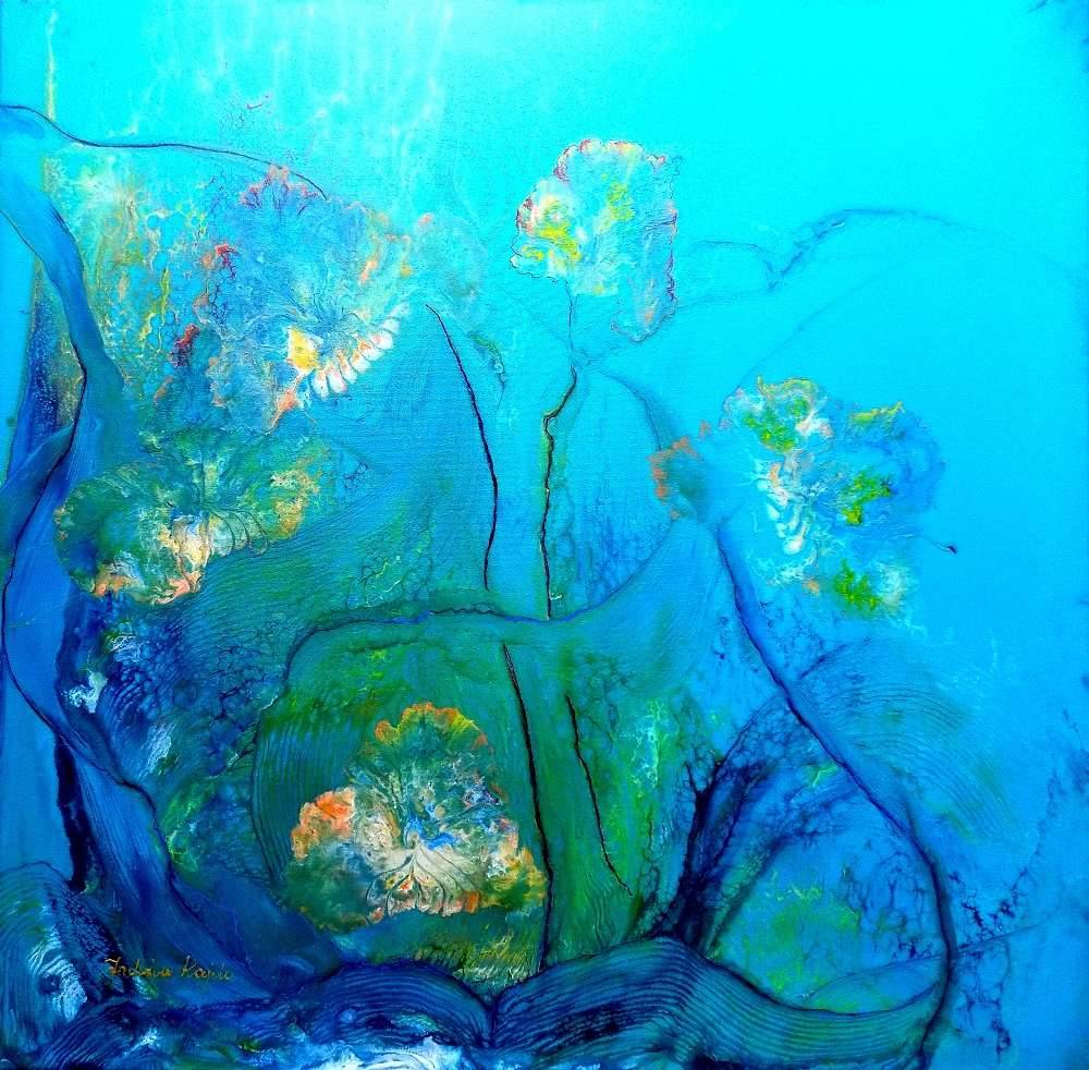 Obraz emanuje niezwykłym urokiem, a dominujący kolor niebieski przywołuje skojarzenia z głębią oceanu. Na pierwszy rzut oka zachwycają delikatne, abstrakcyjne kształty przypominające kwiaty, które wydają się unosić na powierzchni wody. Linie i formy są subtelnie rozmyte, co nadaje całości wrażenie lekkości i fluidności. Atmosfera jest spokojna, wręcz medytacyjna. Ten błękitny świat wciąga jak cichy szept, zapraszając do chwilowego oderwania się od rzeczywistości. Styl artystyczny korzysta z technik impasto, gdzie grubo nakładane farby tworzą fakturalne, trójwymiarowe efekty. Dziecięce „To wygląda jak kwiatki w morzu!” byłoby całkowicie na miejscu. Może to powodować uczucie nostalgii za czasami beztroski. Obraz jest jak dreamscape, co daje odbiorcy swobodę interpretacji. Jego delikatność i harmonia kolorów mogą wywołać uśmiech, a także skłonić do refleksji nad pięknem natury. Osobiście, mógłbym patrzeć na ten obraz godzinami. Senna jakość dzieła przypomina mi letnie popołudnia spędzone na plaży.