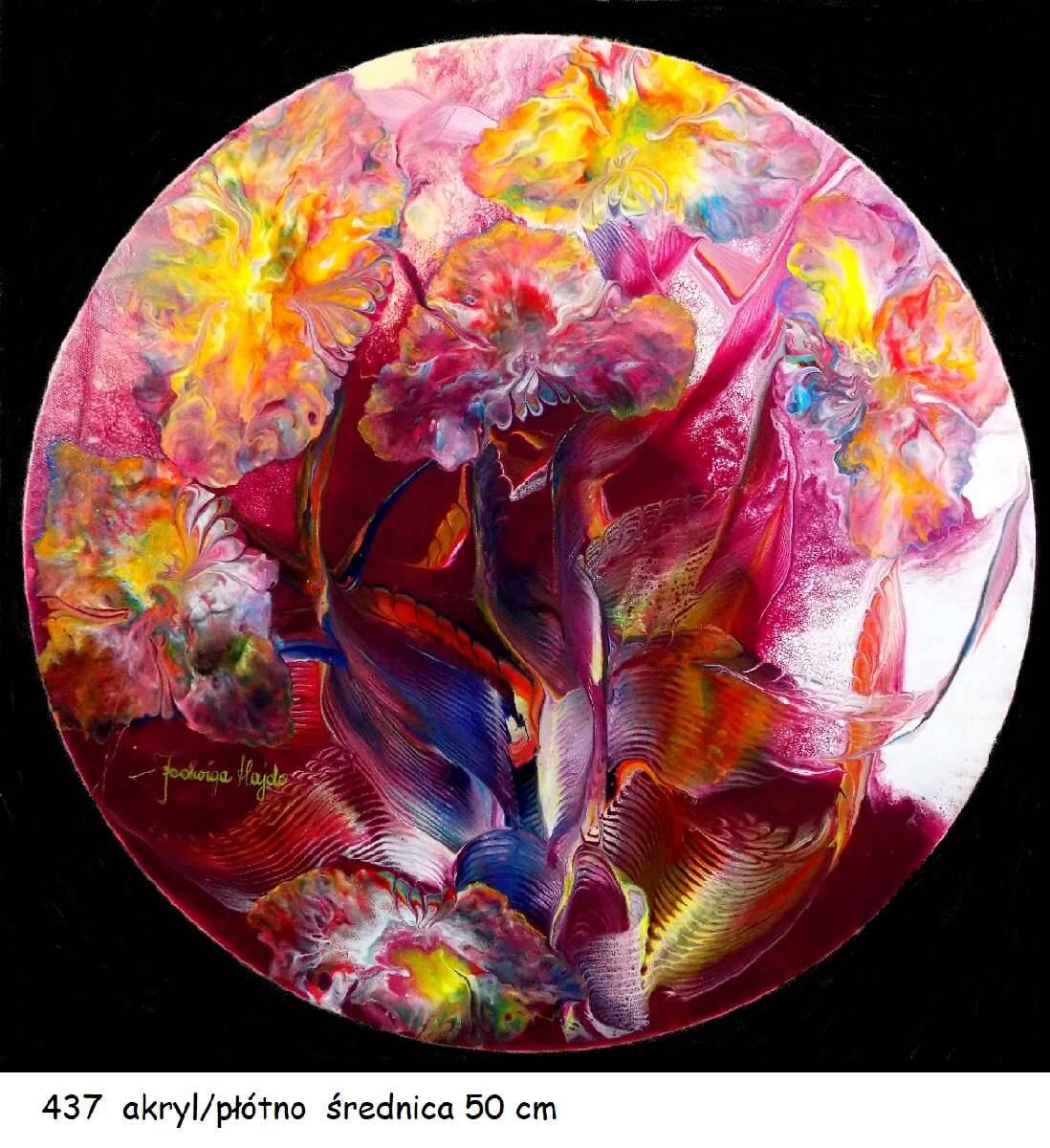 Obraz namalowany farbami akrylowymi na płótnie naciągniętym na okrągły blejtram o średnicy 50 cm. Zabezpieczony werniksem. Podświetlony światłem ultrafioletowym świeci i zmienia kolorystykę.