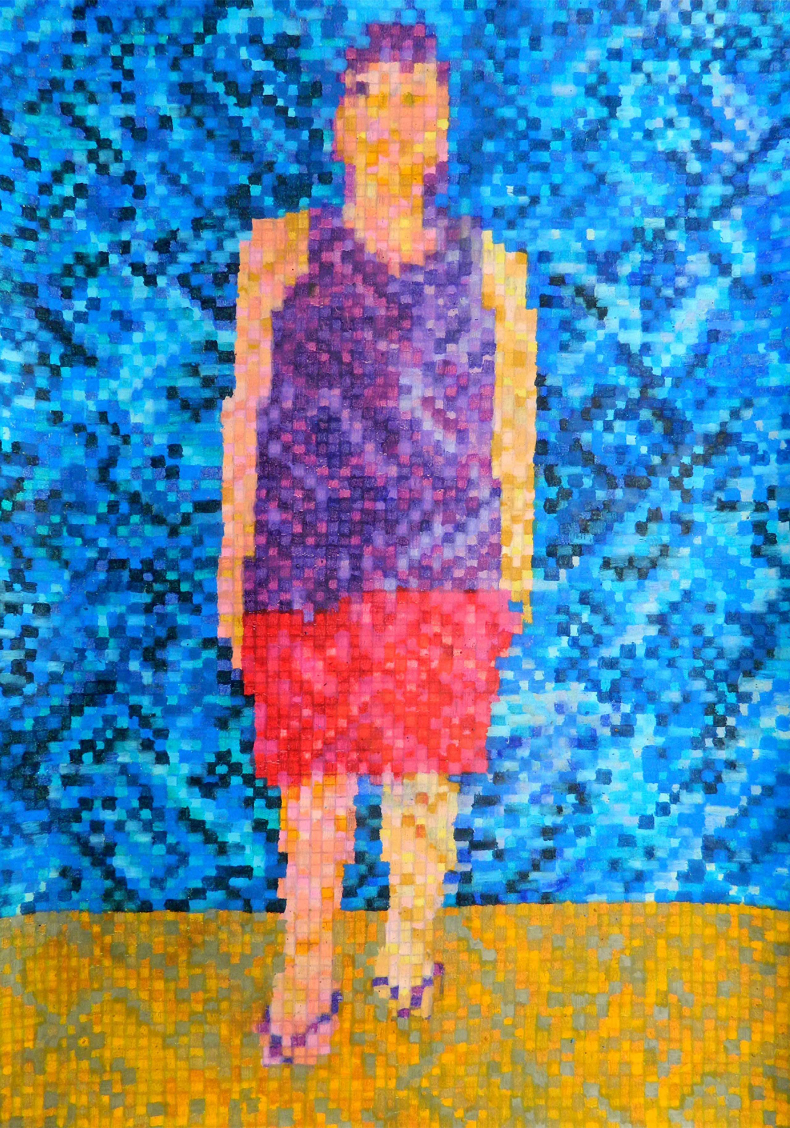 Postać 5 WERONIKA to pastel olejny i suchy na papierze formatu 100x70cm. Jest częścią cyklu prac o postaciach - charakterach. Postacie te jak cienie tylko przypominają realny świat, a należą do innej rzeczywistości: snu i fantazji. Wtopione w język komputerowy nie istnieją realnie a w pixelach, osiągają stan: "w którym wszystko się ze sobą kłóci i nie ma lepszej weryfikacji niż własne przeciwieństwo" prarafrazując J. Cortazara. Są jak światło zamknięte w czterech kątach prostych ideału formy kwadratowej. Ubrane w sieć swojej egzystencji, jeśli by tę sieć rozbić jak porcelanę, rozsypałyby się w małe cząstki: formy 5mm x 5mm gdzie różnorodność barw i światło emanuje cudem.
