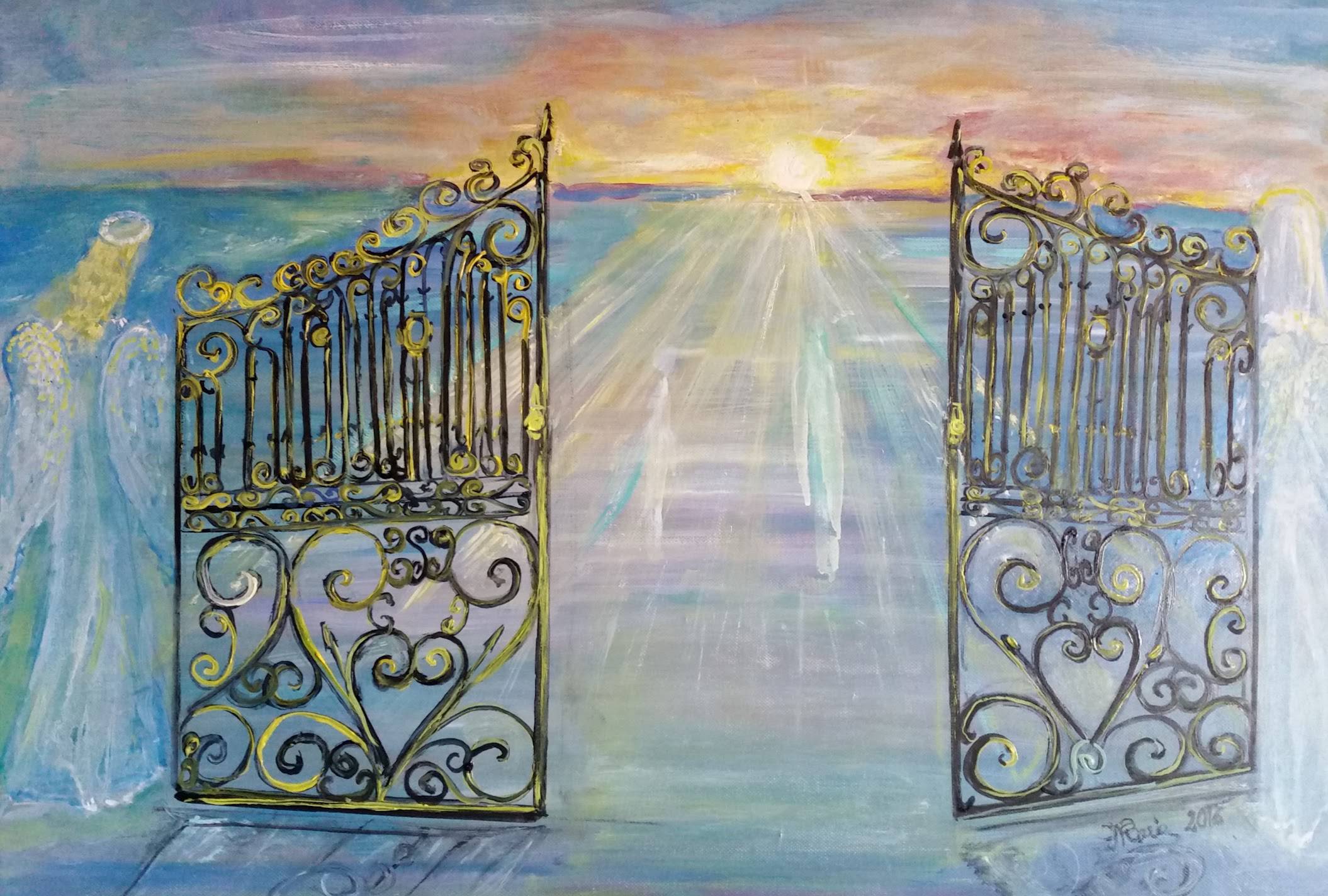 Na obrazie dominuje niebiańska paleta barw. Delikatne odcienie błękitu, różu i złota tworzą świetlistą scenerię. Środek kompozycji zajmuje para misternie zdobionych bram, otwartych ku promieniom słońca, które wzbija się na horyzoncie. Po obu stronach można dostrzec subtelne postacie aniołów, wyglądających jakby były malowane lekkimi pociągnięciami pędzla. Całość emanuje spokojem i nadzieją. Wygląda to jak spełnienie marzeń o niebie, takie "Heaven on Earth". Styl artysty można określić jako oniryczny z lekką nutką impresjonizmu. Delikatne linie i miękkie przejścia barw nadają dziełu subtelnego uroku. Mamy takie uczucie, że jesteśmy zaproszeni do wkroczenia w świat, gdzie czas nie istnieje. Obraz wywołuje mieszankę emocji. Jest w nim zarówno melancholia, jak i radość z otwierającej się przestrzeni. Taki widok może mnie chwilami wzruszyć. „Aniołki są fajne!” mogłoby powiedzieć dziecko. Kompozycja zachęca do refleksji nad życiem, śmiercią i tym, co czeka nas dalej. A Ty, co czujesz patrząc na ten obraz?