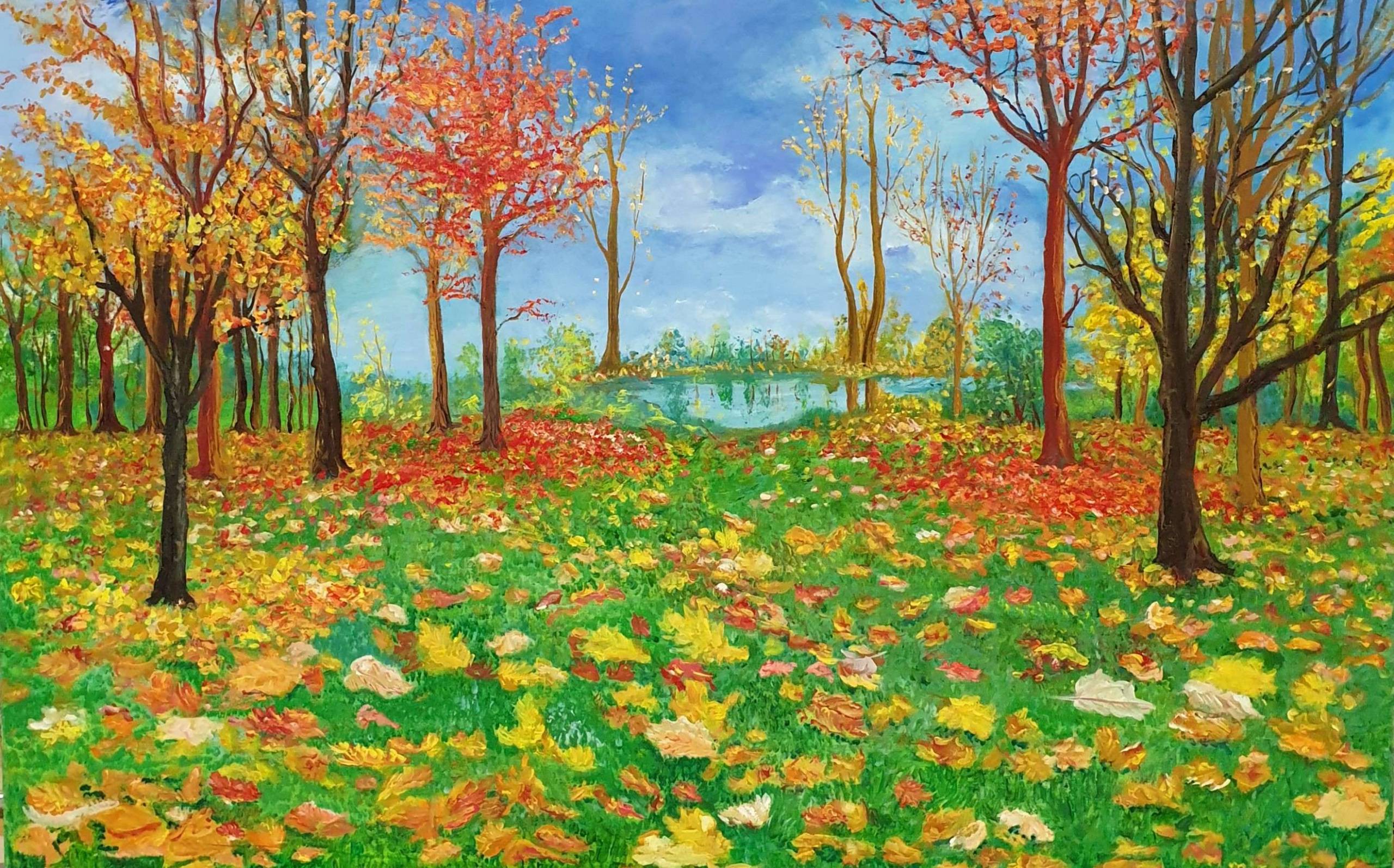 Na obrazie widać pełnię jesieni. Jaskrawe kolory liści - od ciepłych żółci, przez ogniste czerwienie, po głębokie brązy - tworzą malowniczy dywan na zielonej jeszcze trawie. Drzewa tańczą na wietrze, ich gałęzie są jak struny gitary, czujesz to? W tle błękitne niebo przetykane chmurami, a pośrodku krajobrazu jawi się małe jeziorko, odbijające otoczenie niczym lustro. Atmosfera jest spokojna, ale nie pusta. Czujesz powiew wiatru i szelest liści pod stopami. Styl tego obrazu jest jakby impresjonistyczny, artysta skupił się na uchwyceniu ulotności tych chwil w sposób nieco rozmyty, z odważnymi pociągnięciami pędzla. Ta technika dodaje dynamizmu, jakby wszystko było w ruchu. Uczucia, jakie może wywołać ten obraz? Nostalgia. Pewna radość z przemijania, ale też spokój. Patrząc na te kolory, przypomina mi się dzień w parku, kiedy jako dziecko biegałem, rzucając liście. I like to think, że to wszystko jest częścią większego cyklu - wiecie, zmiennego życia natury i nas samych. Słyszę w głowie śmiech i szelest. To dobra jesień.