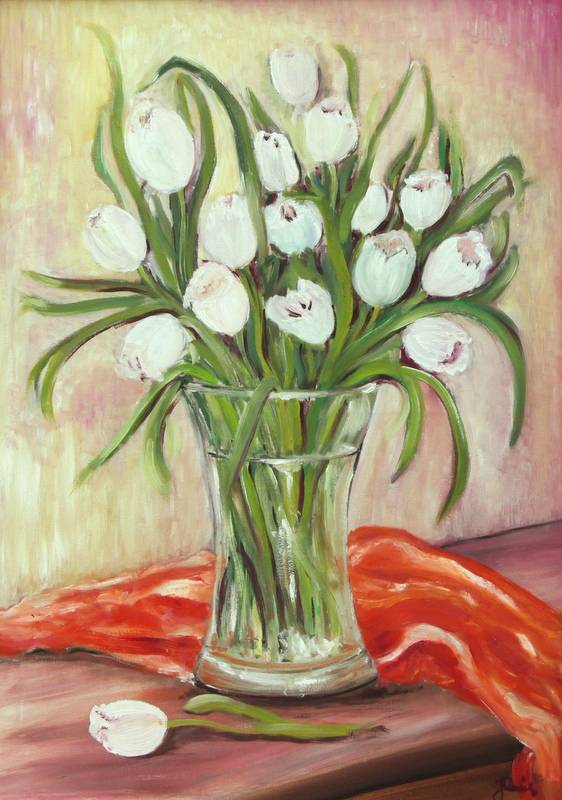 Jadwiga Rudnicka - Białe tulipany z czerwonym szalem