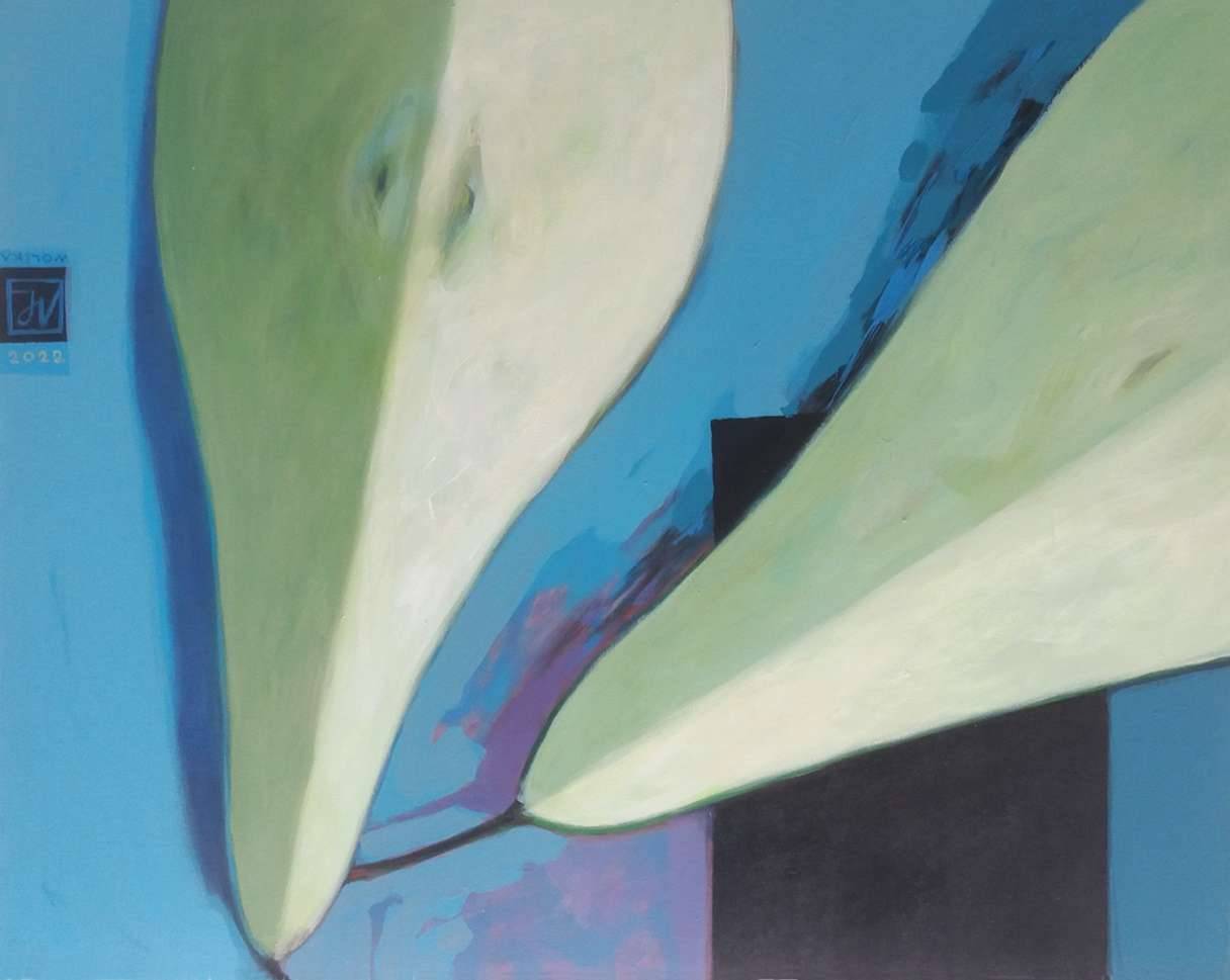 Na obrazie dominują pastelowe odcienie zieleni i niebieskiego, tworzące spokojną, niemal senną atmosferę. Kształty są wydłużone, organiczne, przypominające liście lub abstrakcyjne formy. Tło jest błękitne jak niebo w słoneczny dzień, co dodaje lekkości całej kompozycji. Na pierwszym planie widoczny jest kontrast między jasnością a ciemnym elementem po prawej, co nadaje głębi obrazu. Technika malarska jest tu bogata w subtelne przejścia kolorystyczne i delikatny blending, co sprawia, że czujemy miękkość i płynność. Obraz emituje spokój, a zarazem nutkę tajemnicy, jakby skrywał jakiś sekret. Możesz poczuć się zrelaksowany, ale i zaciekawiony. Artysta zastosował technikę, która przypomina nieco styl fluid painting, to takie "flow" kolorów, w którym każdy detal wydaje się mieć swoje własne, niezależne życie. Czy to nie wygląda trochę jak skrzydła motyla? Podczas gdy patrzyłem na obraz, poczułem pewną harmoniczną symetrię, jakby wszystko było na swoim miejscu. Może to tylko ja, ale ta kompozycja naprawdę do mnie przemówiła. "To jest magiczne!" - powiedziałby 7-latek z zachwytem. Gdy zaczynam myśleć o artysty przesłaniu, czuję, jakby mówił "relax, jest okej".