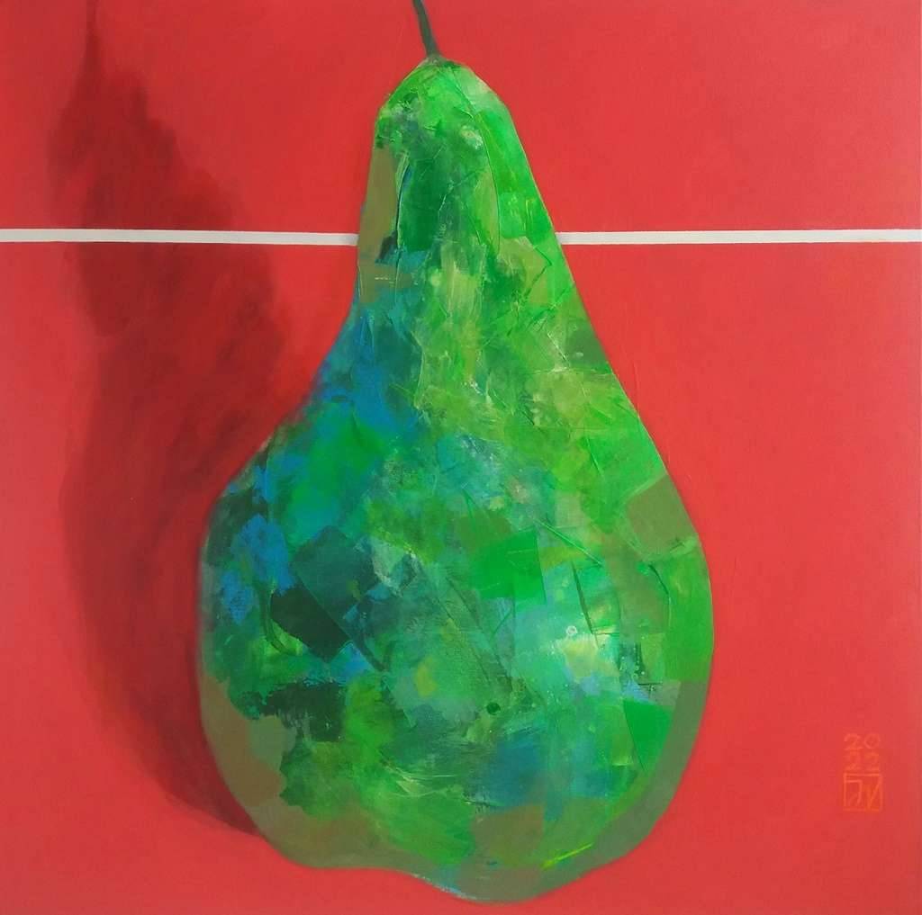 Na obrazie widzimy gruszkę na intensywnym czerwonym tle. Jej forma jest pełna i obfita, malowana w odcieniach zieleni i niebieskiego, które swobodnie przeplatają się ze sobą. Kompozycja jest dość minimalistyczna, co sprawia, że całość wygląda jak żywy wykrzyknik na płótna. Artysta użył techniki impasto, co widać po grubo nałożonych warstwach farby, dodających tekstury i głębi. To trochę jakby ktoś rozlał farby na płótnie i pozwolił im płynąć jak chcą. Atmosfera obrazu jest nieco tajemnicza, ale i uspokajająca. Trochę jakby sztuka mówiła: "Hej, zatrzymaj się na chwilę" To dzieło może wywołać u widza refleksję nad prostotą piękna codziennego życia. Dziecko mogłoby powiedzieć: "O, to wielka gruszka na tle czerwonego słońca!". Każdy pociągnięcie pędzla wydaje się świadome, ale nieprzewidywalne. A może to jest sposób na pokazanie, że w chaosie tkwi order. To interplay między kolorami i fakturami jest niczym inny niż captivating. Patrząc na ten obraz, można poczuć spokój, który przychodzi po deszczowym dniu.