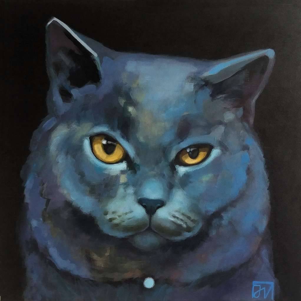 Ten obraz przedstawia majestatycznego kota o hipnotyzujących żółtych oczach, które wydają się przenikać na wskroś. Całość utrzymana w chłodnych odcieniach błękitu i szarości, tworzy kontrast z ciemnym tłem, co sprawia, że kot wydaje się niemal żywy. Kompozycja skupiona na twarzy zwierzęcia, co nadaje mu powagi i tajemniczości. Obraz emanuje spokojem, ale jednocześnie wywołuje lekkie napięcie, jakby kot miał zaraz wyskoczyć z płótna i zacząć miauczeć do Twojego marzycielskiego serca. Technika użyta przez artystę jest zaskakująca - impasto z subtelnym przejściem między kolorami, co dodaje tekstury i głębi. Odbiorca może odczuwać różne emocje, od ciepła i bezpieczeństwa po delikatny niepokój. "Mam wrażenie, że ten kot wie coś, czego ja nie wiem" - mógłby powiedzieć ktoś po dłuższej chwili kontemplacji. Styl artysty jest niezwykle ekspresyjny, z nutą surrealizmu, który przenosi nas do innego wymiaru. Taki obraz może skłonić do refleksji nad ulotnością chwili i pięknem stworzeń, które nas otaczają. Fajne jest również to, jak jeden nudny dzień może zmienić się dzięki takiemu "enigmatic" obrazowi. Bo co tu mówić, to cudo jest jak sen na jawie w kolorze blue.