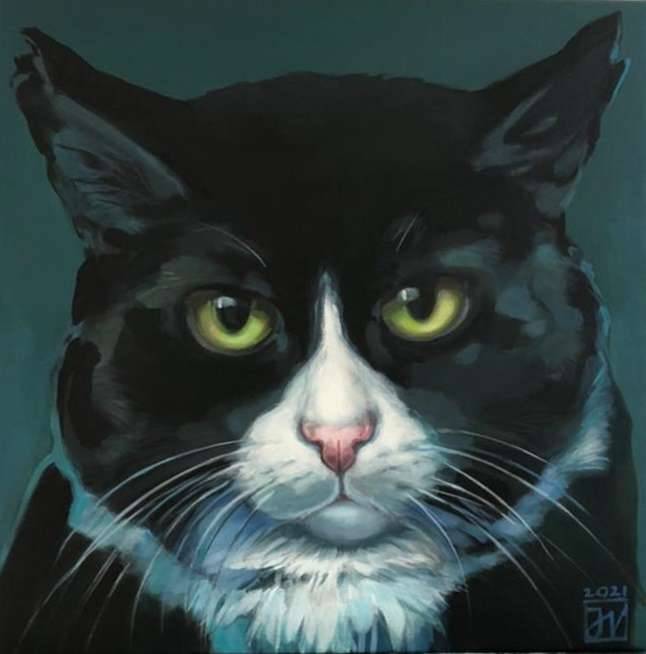 Obraz przedstawia kota, którego intensywne, zielono-żółte oczy przyciągają wzrok w mgnieniu oka. Głębokie kontrasty między czernią a bielą sierści tworzą hipnotyzującą kompozycję, która wciąga odbiorcę. Twarz kota jest umieszczona centralnie, co nadaje dziełu równowagę i harmonię. Kot wyglada troche jakby miał chrapkę na coś. Tło jest utrzymane w matowych odcieniach zieleni, co podkreśla tajemniczy nastrój obrazu. Artysta używa subtelnych pociągnięć pędzla, aby uchwycić detale futra oraz delikatne cienie otaczające kota. Styl pracy jest realistyczny, ale z lekkim zacięciem impresionistycznym, który dodaje obrazu głębii. Atmosfera, którą emanuje to dzieło, jest trochę nostalgiczna, jak wieczorne wspomnienie o przyjacielu. Coś w stylu „cat’s gaze” - tak by można to nazwać, kiedy mowa o intensywności spojrzenia. Emocje, jakie może wywoływać ten obraz, są bardzo zróżnicowane. Każdy, kto patrzy na tę twarz, może poczuć ciepło i spokój, jakby zaglądał w duszę starego, mądrego przyjaciela. Albo przypomnieć sobie, jak kot mruczy na kolanach w zimowy wieczór. Dla dziecka to po prostu miły kotek, który pewnie lubi mleko. Jednocześnie nie sposób oprzeć się przeczuciu, że ten kot ma jakieś tajemnice do ukrycia.
