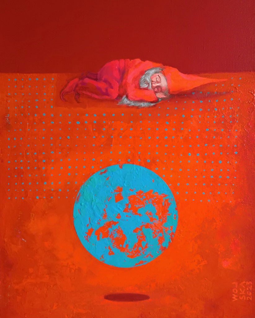 Na obrazie dominują intensywne czerwienie i pomarańcze, które kontrastują z niezwykle wyrazistym błękitem. Główny bohater to postać w czerwonym ubraniu i czapce, zwinięta niczym kotek w kącie płótna. Ciepłe kolory otulają całą kompozycję, dając wrażenie przytulności i spokoju. Atmosfera jest jak sen w letni wieczór, gdzie wszystko wydaje się możliwe. Artysta używa technik nakładania farby, które przypominają zabawę teksturą. Miejscami płótno jest gładkie jak tafla wody, a miejscami pełne chropowatych elementów. Całość wydaje się surrealistyczna, wręcz oniryczna – tak jakby czas i przestrzeń się zaszyły za kurtyną tej czerwonej scenerii. Patrząc na ten obraz, można poczuć spokój i jednocześnie pewną tajemnicę. Zastanawia, dlaczego ta postać tam śpi. Artystę fascynuje prostota formy, a jednocześnie bogactwo emocji, które wywołuje ten blue circle w centrum. To jak dziecięca zabawa w chowanego, gdzie czasem trzeba się zatrzymać i pomyśleć: "Dlaczego tak się dzieje?" Obraz emanuje ciepłem i delikatnością, a jednocześnie prowokuje do refleksji. To takie "dziwne marzenie", które każdy może zinterpretować na własny sposób. Niepewność miesza się z zachwytem, a serce odbiorcy najpierw się uspokaja, by za chwilę znów zabić szybciej.