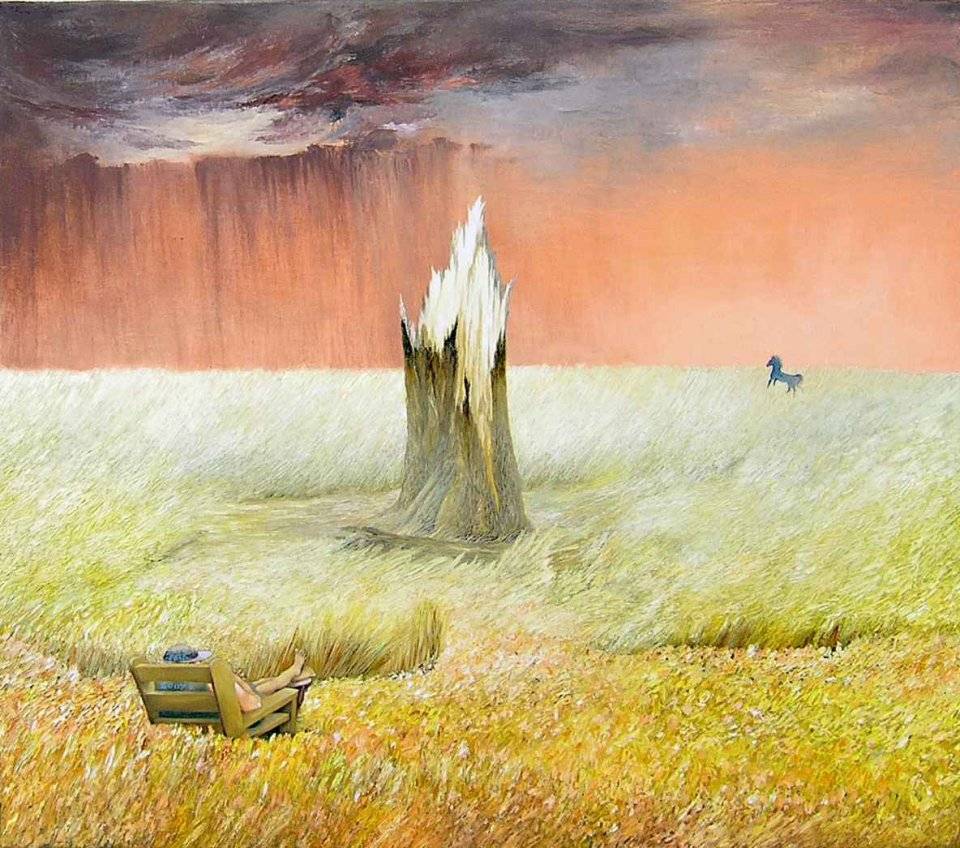 Ten obraz to prawdziwa mieszanka kolorów i kształtów, która przyciąga wzrok od pierwszego spojrzenia. Centralnym elementem jest potężny, martwy pień drzewa, który wyłania się z pastelowego tła przypominającego morze traw. Niebo ma dramatyczne, ciemne chmury z odrobiną pomarańczu tuż przy horyzoncie. Na horyzoncie widać też sylwetkę samotnego konia, co dodaje całości tajemniczości. Obraz emanuje atmosferą nostalgii i melancholii, jakby przypominał o przemijającym czasie. Techniques, które tu zastosowano, to subtelne przejścia kolorów i delikatne pociągnięcia pędzla. Efektem jest dzieło pełne spokoju, ale i niepokoju jednocześnie. Patrząc na to wszystko, można poczuć coś na kształt tęsknoty za czymś, co już nie wróci. Styl artystyczny tego dzieła przypomina nieco surrealizm, z elementami symbolizmu. Pojawiają się myśli o kruchości życia i przemijaniu. Jednocześnie, obraz daje poczucie wolności — może to przez tego konia? Jak mawia siedmiolatek, ten koń wygląda, jakby chciał pofrunąć! To odrobina magic touch w nieco ponurej scenerii. Całość jest nieco intrygująca i skłania do refleksji. Czy i Ty, patrząc na to, też czujesz lekki ukłucie w sercu?