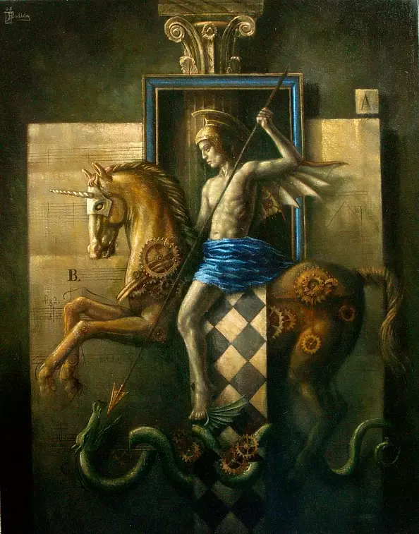 Ciemne, oliwkowe tło otula scenę jak mały teatr, z kolumną i ramą okna, z której wysuwa się rycerz na koniu jednorożcu. Brązy mieszają się z chłodnym błękitem tkaniny, a pionowa szachownica tnie obraz. Mechaniczne koła zebate, litery A i B, nuty i rysunki geometryczne tworzą mapę wiedzy, trochę muzeum, trochę warsztat. Atmosfera gęsta i skupiona, lecz podszyta ironią i niepokojem. Koń ma róg i walczy ze smokiem, super. Pędzel miękki i laserunkowy, miejscami twardy kontur robi klik. Styl to realizm magiczny z odrobiną alchemii. Czuję mit o zwycięstwie rozumu nad chaosem i ciarki na karku. Mam wrażenie, że czas się rozsuwa. wow.
