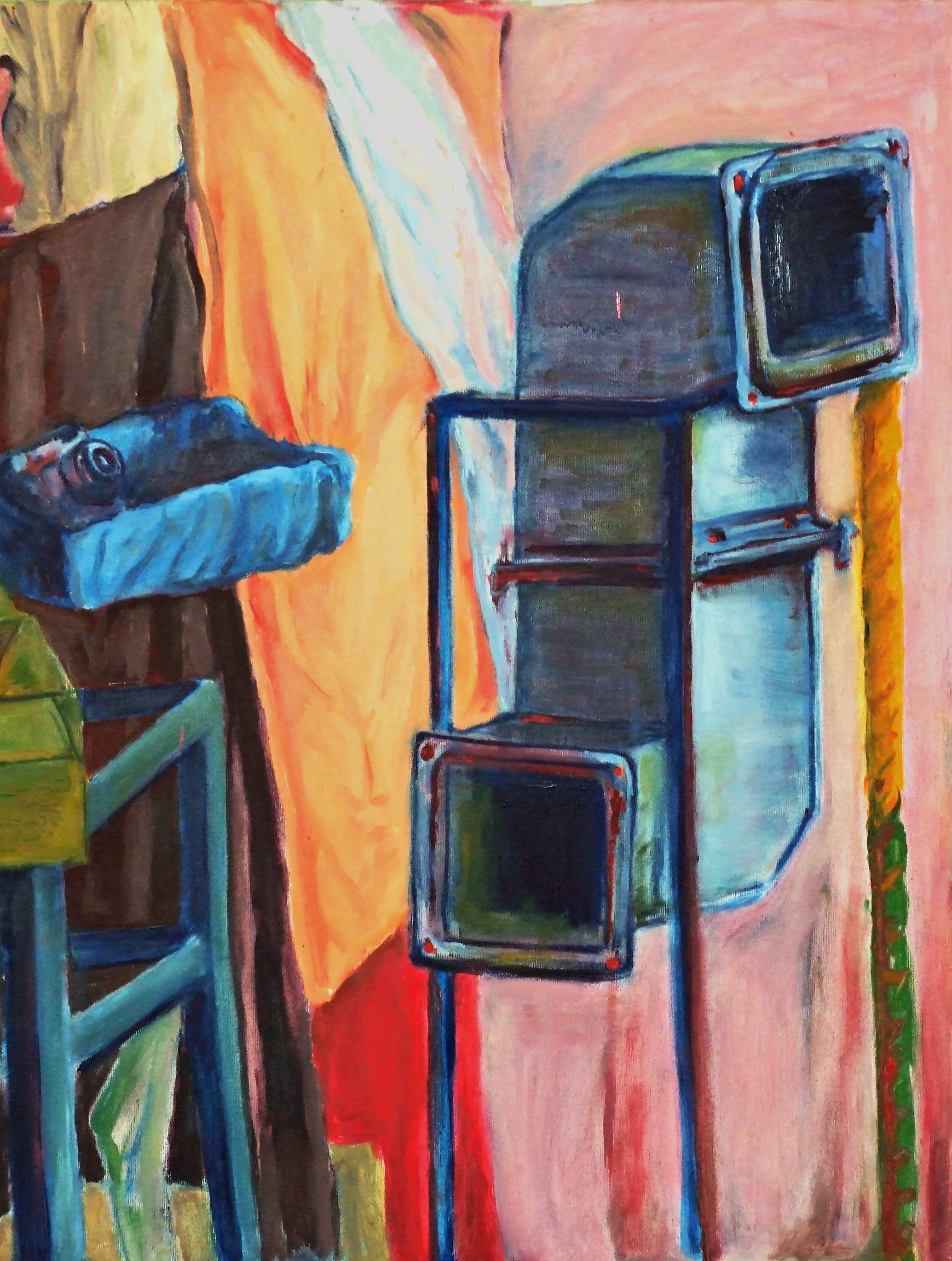 Obraz pełen jest intrygujących kolorów — dominuje tu intensywny pomarańcz oraz niebieskie akcenty, które jakby bawią się z widzem. Kiedy patrzysz, masz wrażenie, że każdy element tańczy w rytmie swojego koloru. Kompozycja wydaje się chaotyczna, a jednocześnie zaskakująco zbalansowana. Na pierwszym planie widzimy konstrukcje przypominające maszyny, być może elementy nowoczesnego miasta. Nastrój tego dzieła to mieszanka nostalgii z czymś kompletnie nowym, jak sentymentalna podróż w przyszłość. Styl artysty przypomina ekspresjonizm z nutą surrealizmu — pędzel pracuje dynamicznie, jakby chciał coś nam opowiedzieć. Farba zdaje się niemal płynąć, a zarazem tworzy wyraziste, spójne kształty. Jest tu coś, co może wywołać u odbiorcy poczucie zagubienia, a zarazem fascynacji. Rodzaj "puzzle" dla oczu i myśli. Emoje? Pewnie — poczucie tajemnicy i ciekawość towarzyszą każdemu spojrzeniu. Dla dziecka mogłoby to być tak: "To wygląda jak wielka, magiczna kamera!". Jest coś w tej pracy, co przypomina mi futurystyczny świat opisany w książkach sci-fi. Aż chciałoby się zanurzyć w tym barwnym wirze i odkrywać kolejne znaczenia. Magic, huh?