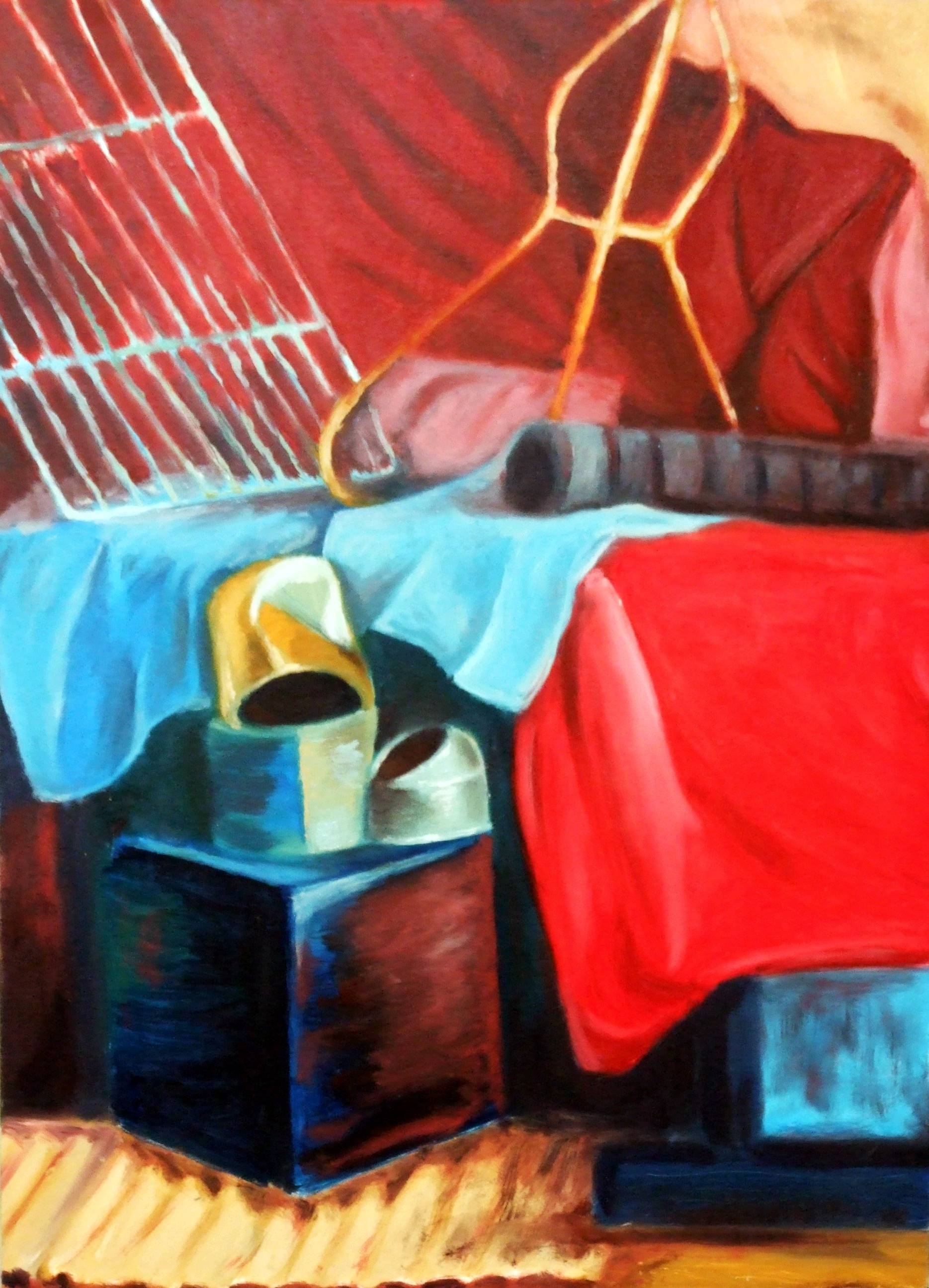 Obraz przyciąga wzrok intensywnymi kolorami i abstrakcyjną kompozycją, gdzie przepych czerwieni kontrastuje z delikatnym błękitem. Na pierwszym planie, na niebieskiej tkaninie spoczywają obiekty o geometrycznych kształtach. Czerwień i złoto w tle zdają się tworzyć iluzję głębi, jakby artysta użył magicznych kolorów z bajki. Układ elementów jest chaotyczny, lecz przemyślany, co nadaje całości niepowtarzalny, dynamiczny charakter. Kiedy patrzę na ten obraz, myślę sobie "ale jazda!" i czuję coś jakby zaciekawienie. Atmosfera jest pełna tajemnicy, jakbyśmy mieli odkryć sekret schowany za każdym pociągnięciem pędzla. Artystyczny styl można określić mianem współczesnego z nutką ekspresji. Pociągnięcia pędzla są śmiałe, a linie tworzą subtelną, lecz zawiłą kompozycję. Patrząc na to dzieło, obraz przypomina mi chaos codzienności, która jednak ma swój urok. It's puzzling, jak niewielkie detale mogą przyciągnąć uwagę na dłuższą chwilę. Obraz wzbudza we mnie refleksję nad zwyczajnością życia, pełnego przedmiotów o prostych kształtach, które w odpowiednim świetle nabierają blasku. A potem myślę, że może warto czasem przystanąć i zobaczyć piękno w tym, co zwykłe. To nasuwa mi myśl, że dzieci często widzą świat w kolorach dużo żywszych niż dorośli. To obraz, który można podziwiać godzinami, odnajdując w nim coś nowego za każdym razem.