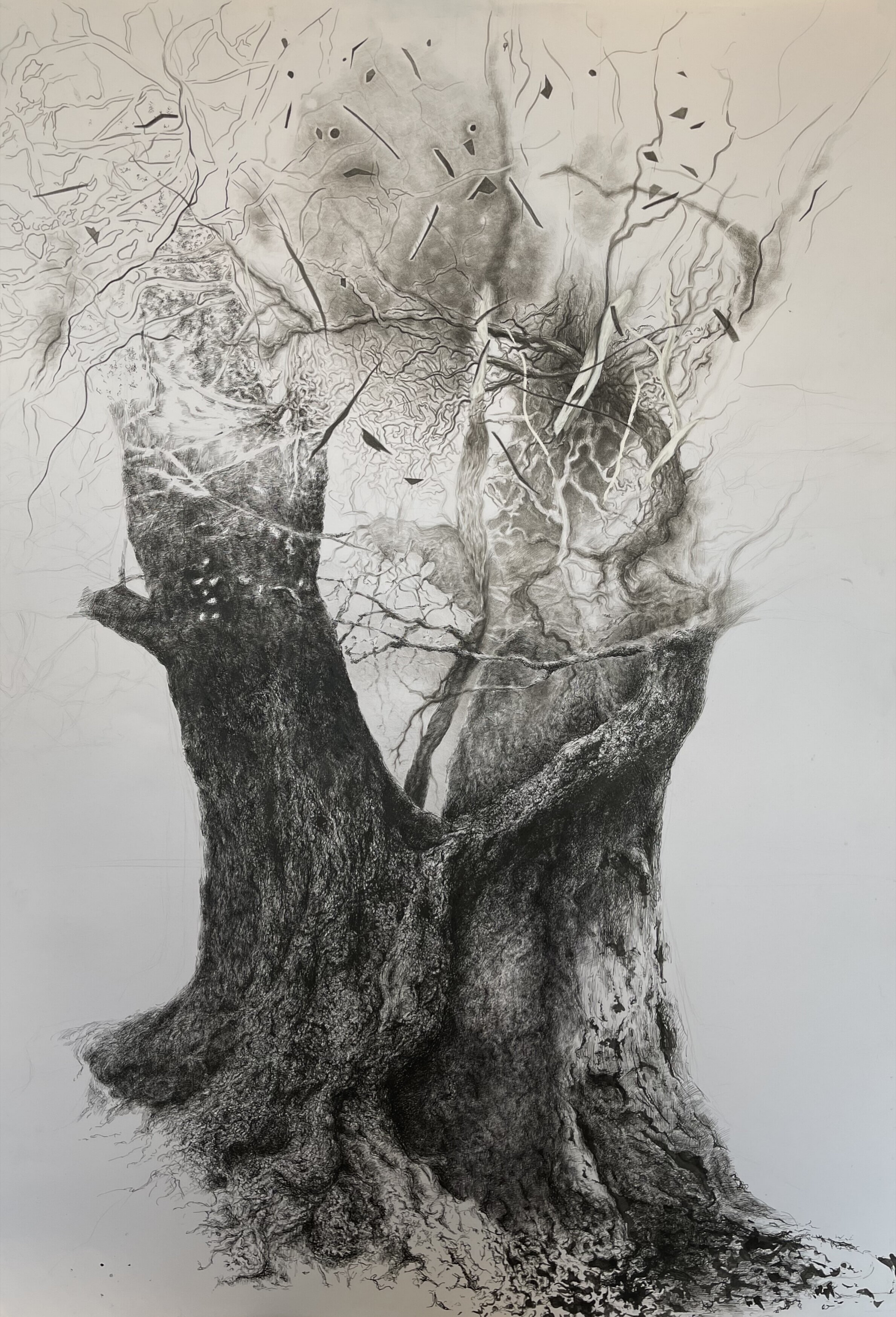 Obraz jest niezwykle intrygujący i pełen detali. Przedstawia masywne, poskręcane pnie drzew unoszące się w delikatnym tańcu gałęzi i korzeni. Czarny węgiel kontrastuje z jasnym tłem, tworząc dramatyczną i surową atmosferę. Artysta zastosował technikę rysunku, skupiając się na fakturze kory i misternie połączonych gałęziach. Wygląda to tak, jakby cała natura tętniła życiem i tajemnicą. Brak wyraźnych barw dodaje dziełu enigmatycznego, nieco melancholijnego klimatu. Patrząc na to, wyobrażam sobie, jak w jakimś magicznym świecie drzewa te mogłyby być starożytnymi strażnikami lasu. Ich splątane sylwetki przypominają labirynty historii i skrywane w nich opowieści. Dzieciak mógłby powiedzieć: "To są drzewa, które mogą rozmawiać!" W jakiś sposób obraz wywołuje uczucie bycia obserwowanym, jakby te drzewa miały swoje sekrety. Styl dzieła jest esencją mrocznego realizmu, w którym misterne, organiczne formy łączą się z abstrakcyjnymi liniami. Emocje, które towarzyszą oglądaniu, to mieszanka podziwu i zadumy, tak jakbyś spoglądał na coś potężnego i jednocześnie ulotnego. Rysunki sugerują biegłość artysty w uchwyceniu zarówno szczegółów, jak i esencji światła i cienia. Zaskakujące jest, jak tak minimalistyczna paleta może być tak pełna ekspresji i depth.