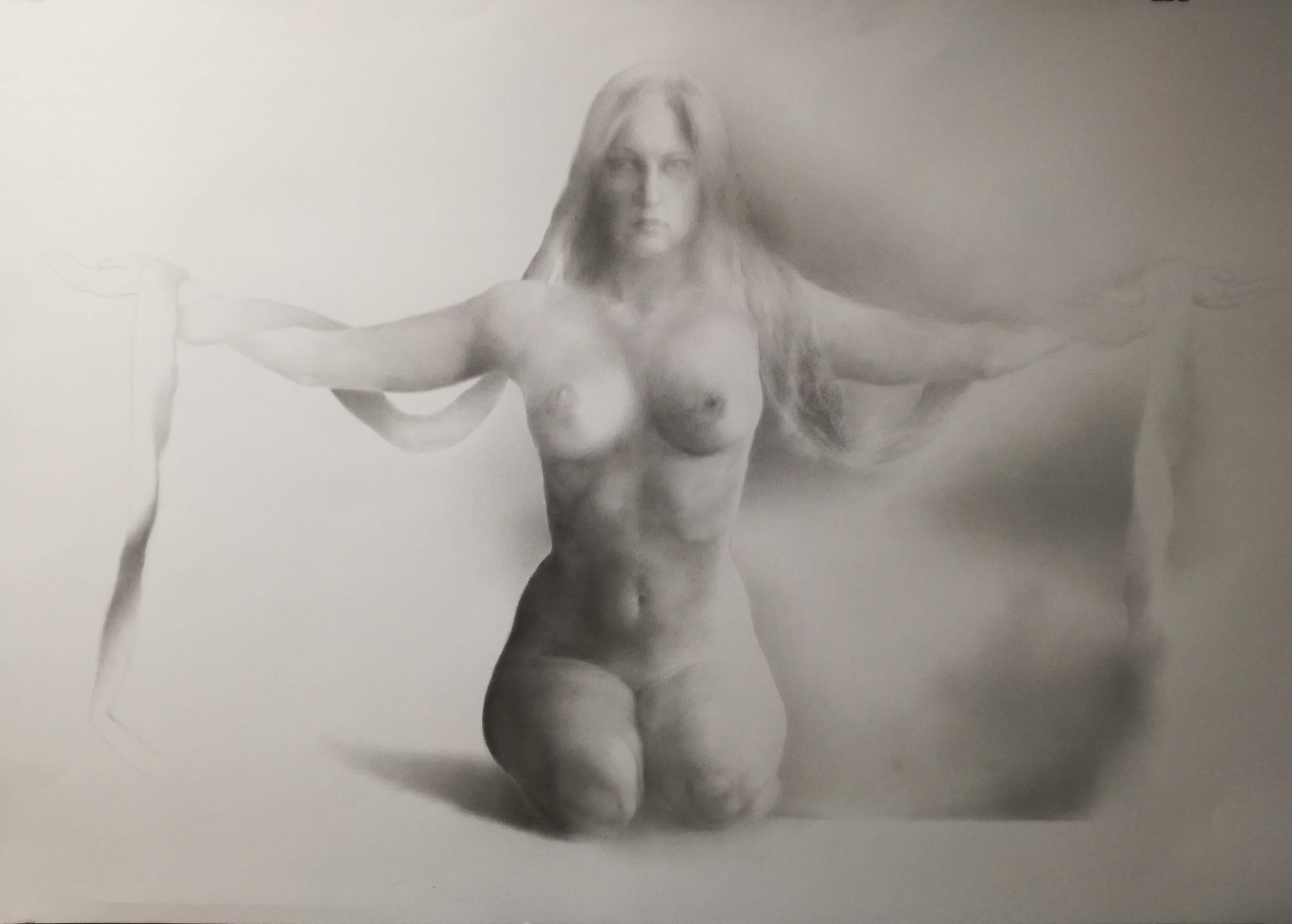 Ten obraz to prawdziwa uczta dla oczu. Dominujące odcienie szarości, subtelne światłocienie tworzą delikatną mieszankę realizmu i surrealizmu. Centrum kompozycji zajmuje kobieca postać, której ciało zdaje się niemal stapiać z otoczeniem. Jej mgliste kontury dodają całości eterycznego, onirycznego klimatu.