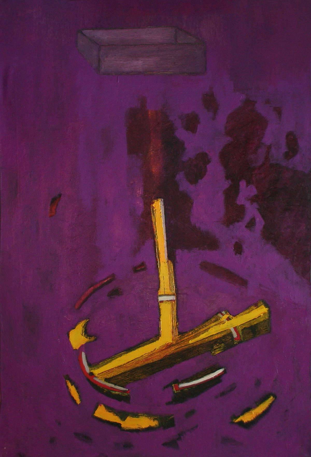 Na obrazie dominuje intensywny fiolet tła, który zdaje się hipnotyzować widza. Na jego tle wyróżniają się żółte kształty o nieregularnych formach. Kompozycja jest dynamiczna i zaskakująca, a centralny element - coś na kształt konstrukcji - przyciąga wzrok swoją złożonością. Obraz emanuje atmosferą tajemnicy i intrygi. Artysta zastosował technikę impasto, którą można zauważyć w bogatej teksturze farby. Styl obrazu jest nowoczesny, z wpływami abstrakcjonizmu. Kolory są kontrastujące, dają energetyzujący efekt na odbiorcę. To jak przejażdżka na rollercoasterze emocji - raz w górę, raz w dół. Być może dla niektórych dzieło to jest zagadką do rozwikłania. Dla innych - zabawą w wyobraźnię. Kto wie, co artysta tak naprawdę chciał powiedzieć? Mój brat powiedziałby: "To wygląda jak coś do budowania". Wygląda to trochę jak zagubiona konstrukcja w kosmosie, unosząca się w nieznanym. Obraz jest "mysterious" i zachęca do własnych interpretacji. Wzbudza pytania, prowokuje myśli. Może to symbol, może tylko chaos w pięknej formie.