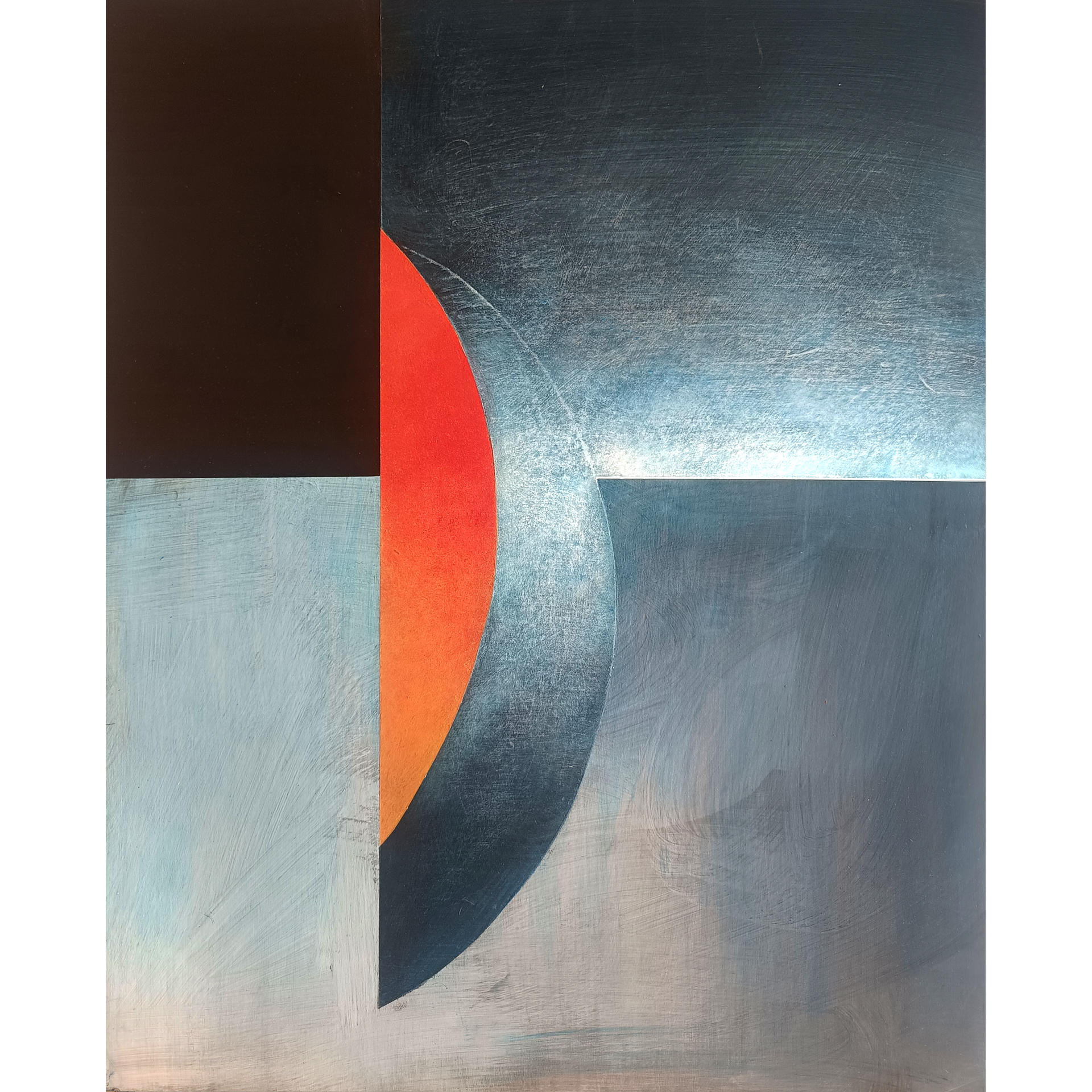 Na obrazie dominują kontrastujące kolory: głęboka czerwień i ciemny błękit. Te intensywne barwy, zestawione z subtelniejszymi, stonowanymi odcieniami niebieskiego i szarości, tworzą fascynującą kompozycję, pełną harmonii i napięcia jednocześnie. Królują tu geometryczne kształty, gdzie półokrąg i prostokąt tańczą ze sobą jakby na scenie. Styl minimalistyczny, ale za to jaki wymowny. Technika, zdaje się, opiera się na subtelnych pociągnięciach pędzla, które dodają obrazowi tekstury i głębi. Co za strange feeling pozostawia ta praca. Obraz wywołuje poczucie enigmy, jakby coś ukrywało się za widocznymi płaszczyznami. Może to przedstawienie zachodzącego słońca lub ciemnego księżyca na tle nieba, które obiecuje burzę. Klimat jest nieco tajemniczy, trochę jak opowieść zaczynająca się za mgłą. Patrząc, można poczuć zarówno spokój jak i niepokój, jakby coś wielkiego miało się wydarzyć. "Ojej, a ja myślałem, że to latający ser!" - powiedziałby pewnie 7-latek, odkrywając własne interpretacje. Osobiście patrząc na to dzieło, czuję z jednej strony pewien dystans, z drugiej ciekawość. Ten obraz przyciąga uwagę swoją prostotą i jednocześnie głębią. Naprawdę intrygujące dzieło.