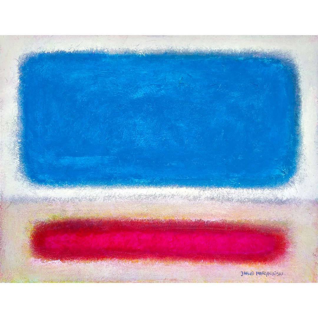 Na obrazku widać intensywną, abstrakcyjną kompozycję, która natychmiast przyciąga wzrok. Dominują dwa wyraziste prostokąty: jeden w jasnym, energetycznym odcieniu niebieskiego, a drugi w głębokim, malinowym różu. Tło jest subtelne, niemalże niewidoczne, co sprawia, że te dwa kolory stają się prawdziwymi bohaterami sceny. Nastroje obrazu są jak letni dzień nad jeziorem: spokojne, ale pełne ukrytej energii. Harmonia tych kolorów daje poczucie ulgi i jednocześnie pobudza wyobraźnię, dając wrażenie nieskończoności i przestrzeni. Styl artystyczny jest urzekający w swojej prostocie, przypominający prace z nurtu color field. Technika rozmycia krawędzi i delikatnych pociągnięć pędzla tworzy wrażenie mgiełki. Wyobraź sobie, że patrzysz na horyzont z rozmazanymi konturami, feeling like you're drifting. Te plamy mogą budzić różnorodne emocje: od spokoju i refleksji po nagłe przebłyski radości. Niebo i lody truskawkowe – oto co widzę! Człowiek przyglądający się obrazowi może poczuć osobistą historię. Może to chwilowa ucieczka od szarej codzienności? Każda kropla farby kryje jakąś tajemnicę. To po prostu hpnotyzujące. Praca zdaje się zadawać pytanie: co nas tak naprawdę porusza? To naprawdę wyjątkowe dzieło sztuki.