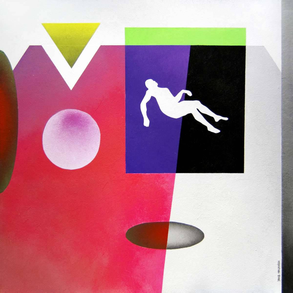 Obraz jest pełen kontrastowych kolorów i wyrazistych kształtów, które tworzą niepowtarzalną kompozycję. Dominują różne odcienie różu, żółci i fioletu, a dynamiczne linie i geometryczne figury przyciągają wzrok. Na pierwszy rzut oka widać, że artysta bawi się formą i kolorem, tworząc coś, co przypomina abstrakcyjny sen na jawie. Atmosfera obrazu emanuje pewną tajemniczością, a może trochę surrealizmem. Czujesz, jakbyś patrzył na coś więcej niż tylko barwy i kształty. Styl artystyczny jest odważny, może trochę eksperymentalny, z użyciem technik takich jak kontrastujące barwy i wyraźne cienie. To trochę jak rollercoaster dla oczu. Patrząc na ten obraz, można mieć wrażenie zanurzenia w chwilowym chaosie myśli. Czujesz dziwne nuty spokoju pomieszane z ekscytacją. Może to przez ten floating figure (tak, dokładnie miałem to na myśli), której obecność nadaje dziełu nieco transcendentalny charakter. Dziecko by powiedziało: "To wygląda jak latający sen!". I wiesz co, coś w tym jest. Może ten obraz to zaproszenie do odkrycia czegoś nowego w codzienności? Fascynujące. Czuję, że każde spojrzenie na to dzieło odkrywa coś nowego.