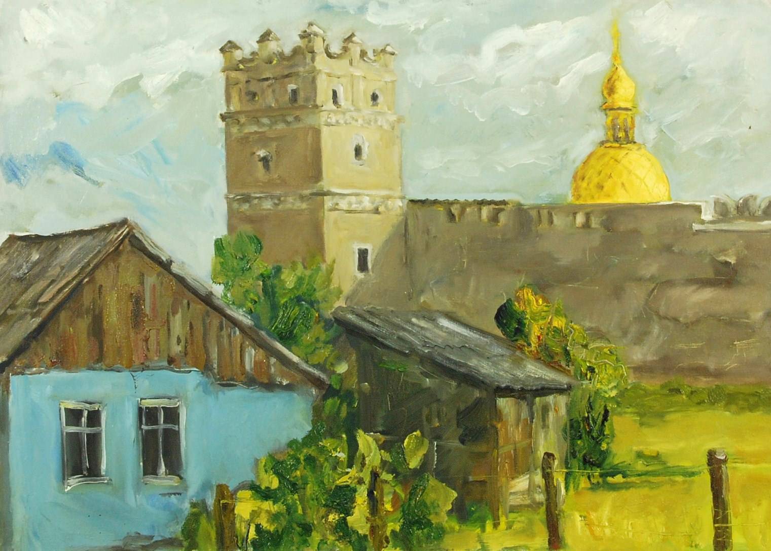 Obraz namalowany na plenerze w Ostrogu (Ukraina) 2000r. Olej na płótnie. Na krawędziach listwy.