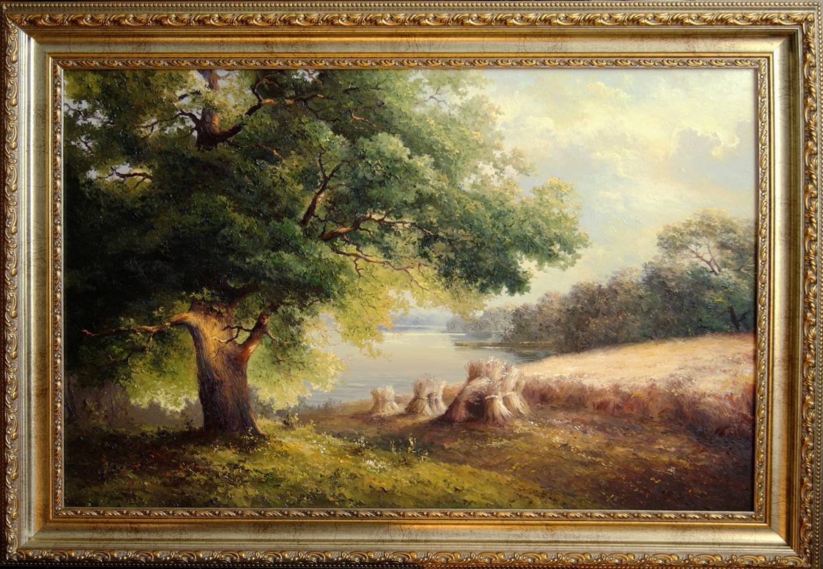 Na obrazie widzimy sielankowy krajobraz, który wypełniają intensywne odcienie zieleni i delikatne żółcie. Głównym bohaterem jest majestatyczny dąb, rozpościerający swoje gałęzie nad polaną. Jego liście szumiące w delikatnym powiewie wiatru kontrastują z błękitnym niebem, które niemal znika za horyzontem. Na pierwszy plan wychodzą również snopy siana, przywodzące na myśl spokojne, letnie popołudnia. Obraz emanuje spokojem i harmonią, jakby czas się zatrzymał. Można by rzec, że jest to "perfect escape" od miejskiego zgiełku. Techniką, którą artysta zastosował, jest zapewne olej na płótnie, z widocznymi pociągnięciami pędzla, które nadają teksturze drzewu i trawie głębi. Patrząc na ten obraz, czuć nostalgię i tęsknotę za prostotą. To jak w opowieści dziecka: "To drzewo jest jak wielki zielony parasol". Drobne detale, takie jak światło przebijające się przez liście, angażują i przyciągają wzrok. Wzbudza to u mnie ciepłe wspomnienia z dzieciństwa. Wydaje się, że artysta chciał, by każdy z nas znalazł tu coś dla siebie, jakby można było usłyszeć szelest liści i śpiew ptaków.