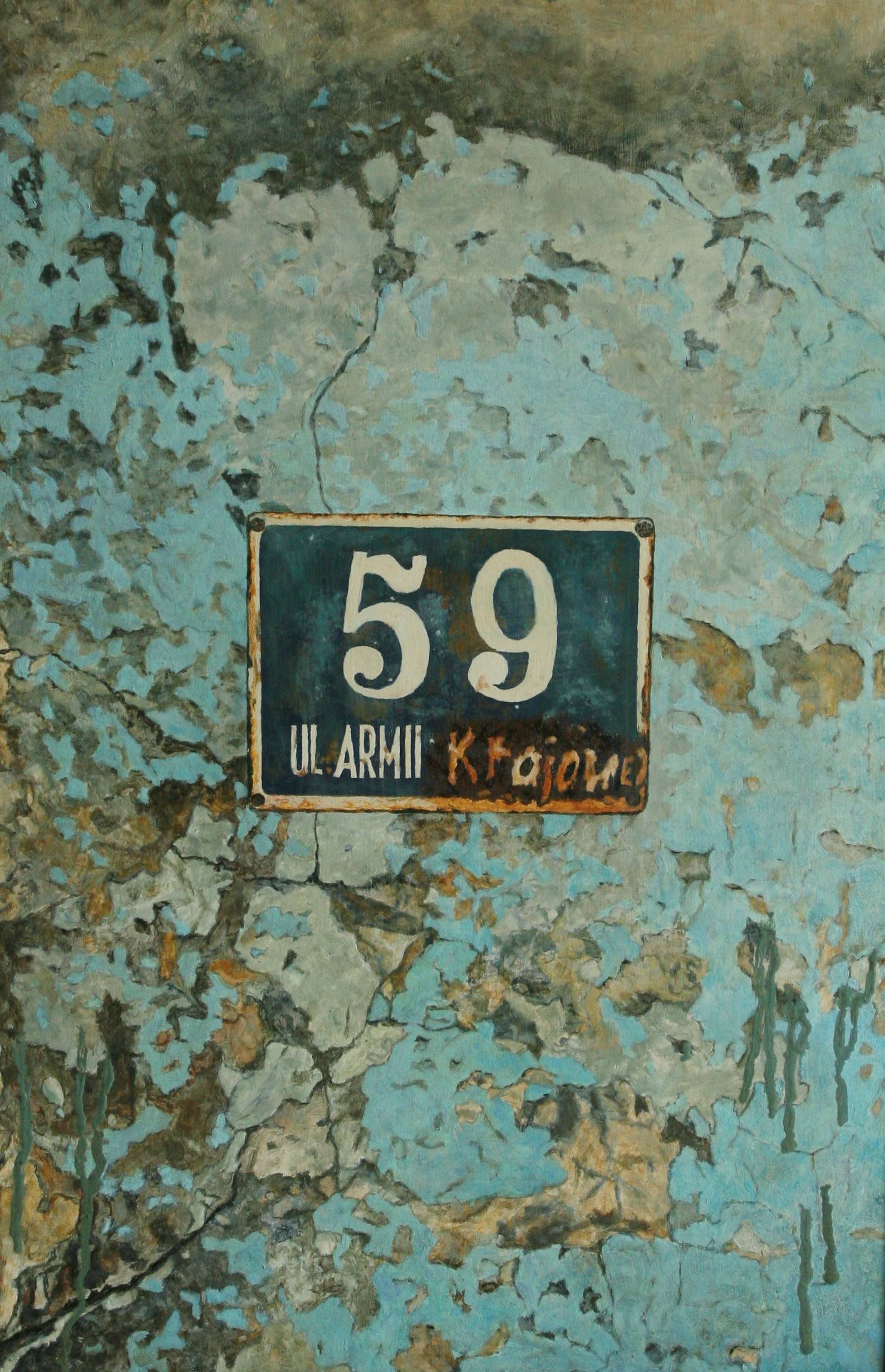 Obraz przedstawia starą, zniszczoną tablicę adresową, zawieszoną na nieco obdrapanej ścianie. Dominują tu odcienie turkusu i brązu, które w nieoczywisty sposób ze sobą kontrastują. Tło wygląda jak gdyby było rozmytym połączeniem chmur i ziemi. Kompozycja jest prosta, ale przyciąga wzrok szczegółami. Ta tablica z numerem 59 umiejscowiona jest centralnie, co dodaje jej pewnej hieratyczności. Atmosfera, jaką emanuje to dzieło, jest nostalgiczną podróżą w przeszłość, wypełnioną lekkim poczuciem tęsknoty za czymś utraconym. Styl obrazu można opisać jako impressionistic. Artysta użył grubych pociągnięć pędzla, a jednocześnie stworzył teksturalne, detale powierzchni, które sprawiają, że całość jest bardziej trójwymiarowa. Patrząc na tę pracę, można poczuć pewien rodzaj sennej melancholii. Mam wrażenie, że artysta chciał, byśmy zastanowili się nad przemijaniem czasu. Element old-fashioned tablicy skłania do refleksji, jak wiele historii może kryć się za tak zwyczajnym miejscem. Dla mnie osobiście ten obraz wzbudził delikatną nostalgię. Tak jakby przypominał o niewidzialnych ścieżkach, które kiedyś ktoś przemierzał. Jest coś pięknego w tej prostocie, coś, co sprawia, że czujesz to ciepło w sercu. Myślę sobie – czy ktoś kiedyś mieszkał w tym domu? Ten obraz jest jak stara fotografia z rodzinnego albumu. Czyż to nie jest fascynujące, jak sztuka potrafi poruszać zakamarki naszej wyobraźni i serca?