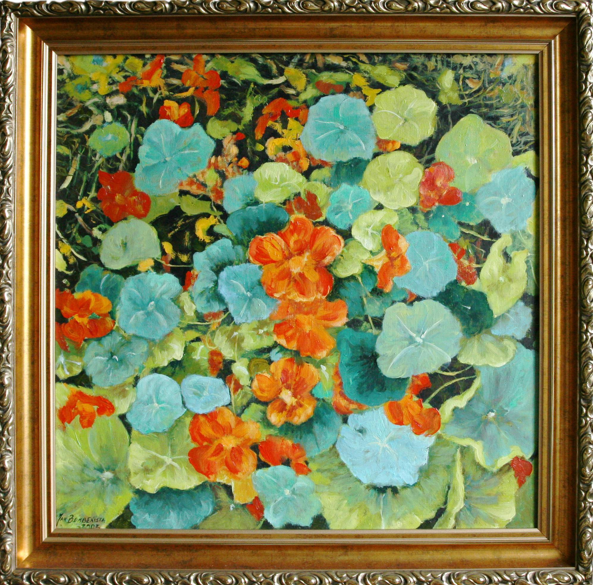 Obraz ten to prawdziwa uczta dla oczu. Dominują na nim intensywne barwy, które przyciągają wzrok, jak błyszczące na słońcu kolorowe konfetti. Niebiesko-zielone liście przeplatają się z płomiennymi ciepłymi odcieniami pomarańczy i czerwieni. Kompozycja jest swobodna, wręcz dzika, co nadaje obrazowi radosny chaos. Aura, którą roztacza, przypomina letni dzień w ogrodzie pełnym życia. Czujesz, jakby te kwiaty zaraz miały wyjść z ram, by zatańczyć wokół ciebie. Artysta z wprawą łączy impasto z subtelnymi przejściami kolorów, tworząc efekt głębi i dynamizmu. Grube pociągnięcia pędzlem podkreślają teksturę liści, sprawiając, że niemal możesz poczuć ich chropowatość. To co wyróżnia ten obraz to jego *vibrancy*. Patrząc na niego, człowiek może poczuć się jak dziecko, które z radością odkrywa piękno natury. "To jakby ktoś rozsypał skarby ogrodu na płótnie!" - mogłoby wykrzyknąć zachwycone dziecko. Obraz ten niesie ze sobą nostalgię za wakacyjnymi chwilami spędzonymi na łonie przyrody. Może wzbudzać uczucie radości, a jednocześnie tęsknoty za tym, co ulotne i piękne. Choć czasem potrzeba chwili, by dostrzec jego wszystkie niuanse, to każda sekunda spędzona na jego podziwianiu jest tego warta.