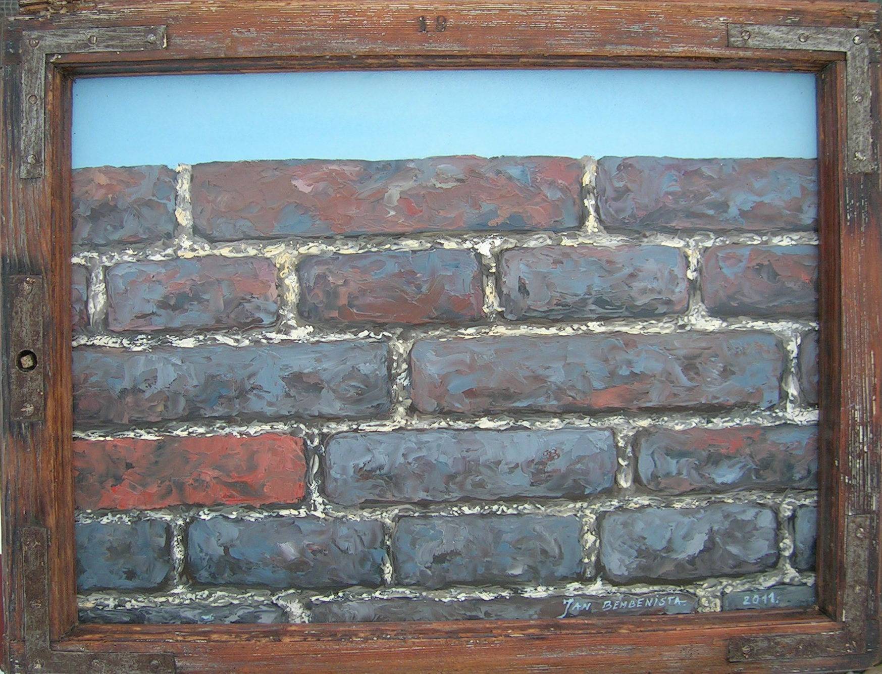 Na tym obrazie widzimy dość niezwykłą kompozycję, która na pierwszy rzut oka przywodzi na myśl zwykłą ceglaną ścianę. Cegły są malowane w odcieniach głębokiej czerwieni i przytłumionego granatu, z delikatnymi akcentami szarości, które dodają tekstury i głębię. Artysta zdecydował się na ramę przypominającą drewniane okno, co nadaje całości niemal surrealistyczny kontekst. Nastrój obrazu jest spokojny, ale jednocześnie wywołuje pewne napięcie, jakby ściana miała skrywać jakąś tajemnicę. Użyta technika to zapewne impasto, gdyż faktura farby wydaje się gruba i wyczuwalna, co daje wrażenie, że cegły mogą być dotykalne. Odbiorca może poczuć się trochę zaintrygowany, jakby widział coś znajomego, ale umieszczonego w nieoczywistym kontekście. Moja mama mówi, że to magiczna ściana! Obraz wręcz zaprasza do refleksji nad granicami rzeczywistości. It's like looking through a window to another dimension. Osobiście czuję, że artysta bawi się naszym postrzeganiem, zmuszając do zastanowienia, co tak naprawdę chcemy zobaczyć za tą ścianą. Coś w tym jest niesamowitego, prawda?