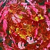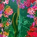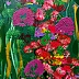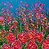 Obraz jest prawdziwą eksplozją koloru i radości. Intensywne odcienie czerwieni i różu kwiatów kontrastują z głębokim błękitem tła, tworząc wrażenie, jakby kwiaty tańczyły na wietrze. Artysta zastosował dynamiczne pociągnięcia pędzla, co nadaje kompozycji ruchu i życia. Kwiaty mają różnorodne kształty, od delikatnych, niemal impresjonistycznych plam, po wyraziste, krągłe formy. Nastrój jest niesamowicie optymistyczny, a widz, patrząc na obraz, niemal czuje powiew letniego wiatru. Styl jest żywiołowy, pełen swobody. Można odnieść wrażenie, jakby artysta chciał przekazać swoją miłość do natury w jak najbardziej bezpośredni sposób. Textura farby, widoczna w zbliżeniu, dodaje do dzieła głębi i zachwyca swoją fizycznością. To jakby oglądanie pola kwiatów przez pryzmat kalejdoskopu. Obserwator może poczuć się jak dziecko, które po raz pierwszy biegnie przez łąkę pełną kolorów i zapachów. "Patrz, mamo, te kwiaty są takie duże!" mogłoby zawołać zachwycone dziecko. Obraz emanuje energią i przypomina o prostych radościach życia. To little piece of happiness na jednej płaszczyźnie. Doceniam tę spontaniczność i radość – uczucia, które trudno wyrazić słowami.