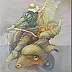 Obraz przedstawia surrealistyczną scenę, która przyciąga wzrok swoją niezwykłością i zaskakującym połączeniem elementów. Dominują tu delikatne, pastelowe kolory — blade odcienie żółci, zieleni i błękitu, które tworzą oniryczną atmosferę. Centralnym punktem jest postać przypominająca jeźdźca na dziwacznej bestii o rogatym łbie, łączącej cechy zwierzęcia i maszyny. Kształty są płynne, niemal organiczne, a kompozycję cechuje dynamiczność — postać zdaje się być w ruchu, jakby zaraz miała przemknąć obok. Atmosfera obrazu jest tajemnicza i pełna niepokoju. Wywołuje w odbiorcy poczucie zagubienia w nieznanym świecie, a może i nostalgię za czymś, co nigdy nie istniało. Styl jest zdecydowanie surrealistyczny, przypomina prace mistrzów tego nurtu jak Dalí. Artysta używa subtelnych technik — może to być mieszanka pasteli i akwareli — co dodaje lekkości i ulotności całości. Patrzymy na ten obraz i czujemy się jak w marzeniu, które jednocześnie fascynuje i niepokoi. Może gdzieś głęboko skrywa smutną prawdę, że rzeczywistość to tylko iluzja. Wow, ale dziwne zwierzątko, powiedziałoby zapewne dziecko, zapatrzone w obraz. Te elementy fantasy i dreamlike quality sprawiają, że dzieło jest wyjątkowe, a jednocześnie skłania do zastanowienia się nad głębszym znaczeniem ludzkiej wyobraźni.