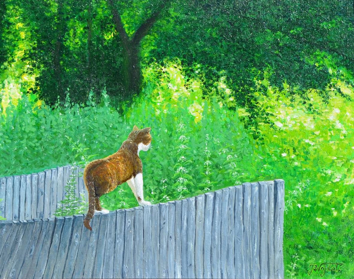obraz olejny na płótnie zabezpieczony werniksem.Emanuje z niego cisza jaka towarzyszy kotu przy łowach cały ogród zarośnięty pokrzywami skąpany jest w słońcu.