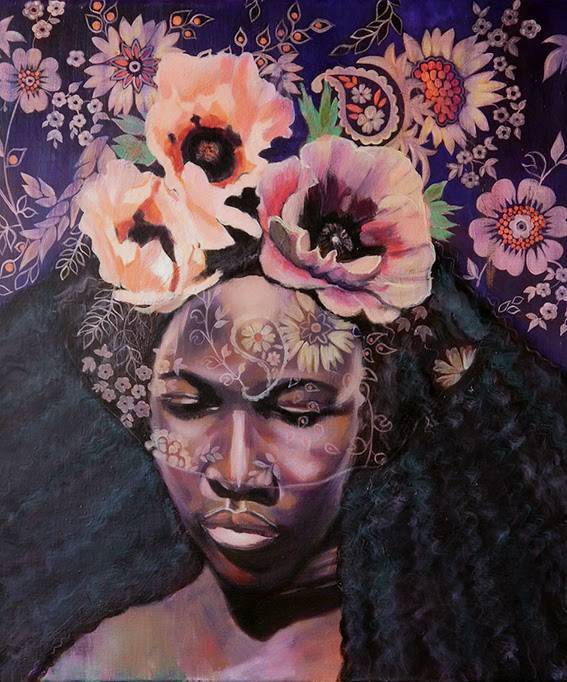 Na obrazie dominują głębokie kolory – intensywne fiolety i delikatne róże łączą się w magiczny sposób tła. Twarz kobiety, otoczona gęstwiną bujnych włosów, jest ozdobiona motywami kwiatowymi w pastelowych odcieniach, które przypominają tatuaż albo sen. Kwiaty, umieszczone na jej głowie, wydają się wrastać w nią, tworząc unikalną koronę, co jest simply amazing! Atmosfera tego dzieła emanuje spokojem, jakby uchwycono chwilę refleksji i spokojnej zadumy. Artysta użył mieszanych technik, balansując między realizmem a onirycznym surrealizmem. Obraz pobudza emocje. Może jednocześnie cieszyć oko i skłaniać do refleksji nad złożonością natury ludzkiej i jej związkami z przyrodą. Dzieło jest jak tajemniczy ogród, wypełnione pięknem i głębią. Podoba mi się to! Styl artysty jest nieco romantyczny, może nawet barokowy w detalach i bogactwie form. Patrząc na ten obraz, wraca wspomnienie z dzieciństwa: "Mamo, chciałbym mieć kwiaty we włosach jak ta pani!" Niesamowite, jak sztuka potrafi zabrać nas w inne światy. Ten obraz jest jak cicha sonata, której dźwięki pozostają z nami długo po zakończeniu.