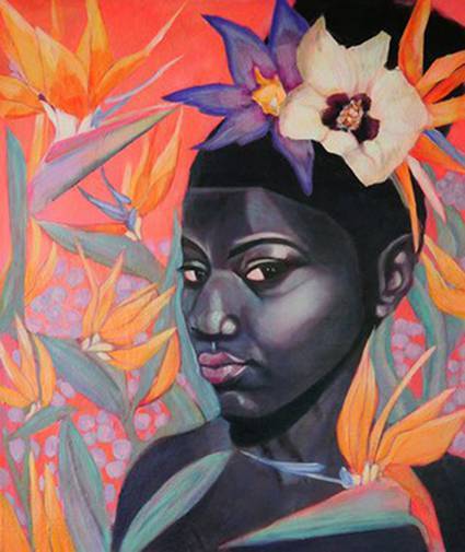 Obraz tętni życiem dzięki jaskrawym kolorom i różnorodnym kształtom. Dominują tutaj odcienie pomarańczu, fioletu i zieleni, które tworzą harmonijną kompozycję. Centralną postacią jest kobieta o ciemnej karnacji, otoczona misternie namalowanymi kwiatami. Jej spojrzenie jest pełne tajemnicy, jakby skrywało jakieś magiczne sekrety. Co widzisz, gdy ją oglądasz? Atmosfera obrazu jest zmysłowa i nieco egzotyczna. Kwiaty wokół niej zdają się niemal pulsować życiem, co potęguje wrażenie, że cała scena jest częścią jakiegoś snu. Artysta zastosował styl, który przypomina impresjonizm z nutką surrealizmu, dodając tekstury i detale, które przyciągają wzrok. Techniki te sprawiają, że obraz jest full of magic. Obraz może budzić różnorodne emocje. Dla niektórych jest on przejawem odwagi i piękna, dla innych – miejscem schronienia przed szarą rzeczywistością. Jeden z widzów mógłby pomyśleć: ojej, to wygląda jak rajski ogród z bajki! Subtelne cieniowanie i kontrasty dodają głębi, tworząc przestrzeń, która zaprasza do refleksji nad pięknem i tajemniczością otaczającego nas świata.