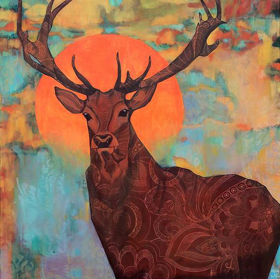 Na tym obrazie widzimy majestatycznego jelenia, który dumnie prezentuje swoje rozłożyste poroże na tle płonącego pomarańczowego słońca. Kolory są intensywne i przyciągające wzrok; pomarańcze mieszają się z różnymi odcieniami błękitu i zieleni, co tworzy harmonijną, ale dynamiczną kompozycję. Kształt jelenia wypełniony jest misternymi, wzorzystymi motywami, które dodają mu niemal magicznego charakteru. Atmosfera jest jakby oniryczna, z lekką nutą tajemnicy. Czujesz się trochę jakbyś patrzył na "dreamscape", który balansuje między rzeczywistością a snem. Styl artysty jest pełen ekspresji, a jednocześnie precyzyjny w detalach. Technika mieszania kolorów i wzorów sprawia, że obraz żyje. Dziecko powiedziałoby: "Jeleń jest jak z bajki!” To prawda, bo emanuje spokojem, ale też pewną dzikością. Obraz może wywołać poczucie zachwytu, wolności i pokoju. A może nawet tęsknoty za naturą, której coraz mniej w codziennym życiu. Te mocne barwy i wzory mogą przypominać widzowi o pięknie i złożoności przyrody, które warto chronić.
