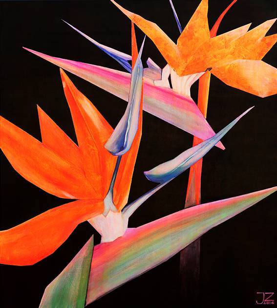 Na obrazie widzimy eksplozję kolorów, które przyciągają wzrok i niemal hipnotyzują. Intensywna pomarańcz połączona z subtelnymi odcieniami fioletu i niebieskiego tworzy niepowtarzalny kontrast na ciemnym tle. Kompozycja jest dynamiczna, pełna ostrych kształtów przypominających dzikie ptaki w locie. Atmosfera obrazu jest pełna energii, ale jednocześnie emanuje spokojem, jakby zatrzymany w czasie moment. Artysta zastosował techniki charakterystyczne dla stylu surrealistycznego z domieszką abstrakcji. Wydaje się, że użycie jaskrawych kolorów akrylowych podkreśla organiczność form roślinnych. Obraz może wywoływać różne emocje – od zachwytu po refleksję nad pięknem natury. Można się poczuć jak w magicznym ogrodzie, gdzie wszystko jest możliwe. Ktoś patrząc na ten obraz mógłby pomyśleć "Wow, it's amazing!" Te barwy przypominają mi lato, kiedy kwiaty kwitną i wszystko jest takie żywe. Jak mały dzieciak, powiedziałbym, że to kwiatek ptak! Przykuwająca prostota formy i bogactwo kolorów przenoszą nas w świat wyobraźni i marzeń. Patrząc na to dzieło, czuję przypływ energii i chęć odkrywania.