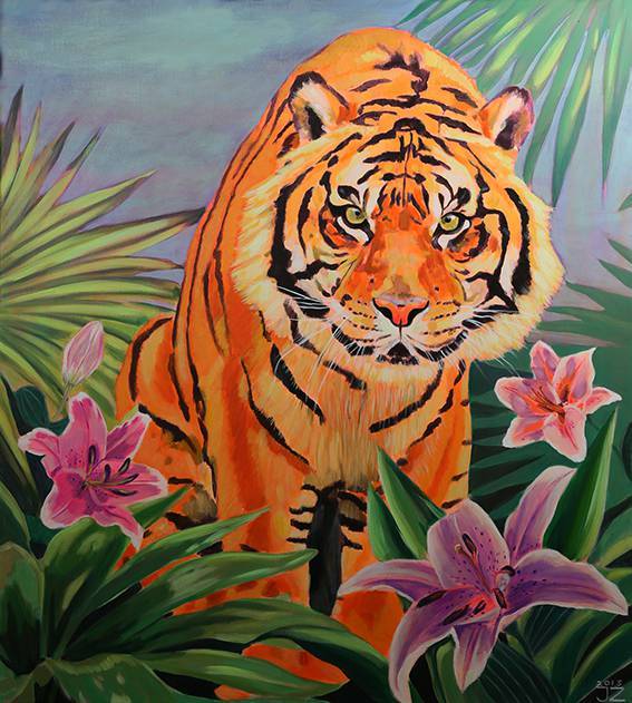 Na obrazie widać majestatycznego tygrysa, który niemal wychodzi z dżungli prosto na nas. Wzór jego futra to intensywne połączenie pomarańczowego z głęboką czernią, które od razu przyciąga wzrok. Otoczenie tworzą bujne, zielone liście oraz różowe lilie, dodające kompozycji nieco delikatności. Patrząc na to dzieło, czuje się dzikość i siłę natury, ale też jakby tęsknotę za jej pięknem. Tygrys spogląda prosto przed siebie, emanując odwagą i ciekawością, jakby miał powiedzieć Hello! Technika, której użył artysta, jest odważnie ekspresjonistyczna. Pociągnięcia pędzla są dynamiczne, niemal chaotyczne, a mimo to każdy element ma swoje miejsce. Czy ja bym się bał tygrysa? Trochę tak. Obraz potrafi wzbudzić mieszankę emocji: zachwyt nad pięknem przyrody połączony z szacunkiem do jej nieprzewidywalnej strony. Osobiście widzę w tym tygrysie symbol determinacji i niezależności, co skłania do refleksji. Moje przemyślenie – czasem warto spojrzeć naturze prosto w oczy. Sprawia, że czujesz się, jakbyś stał w samym środku dżungli, w której czas przestaje być istotny.