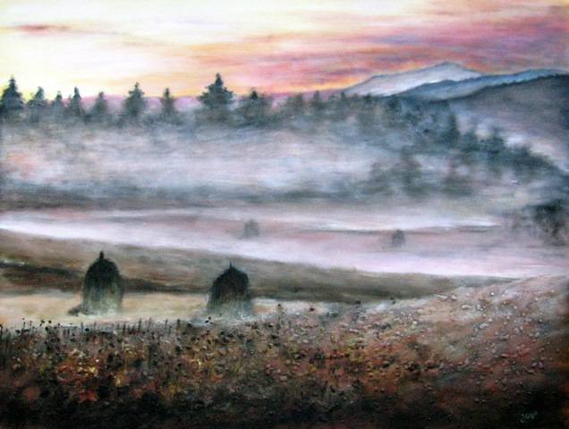 Na obrazie widzimy malowniczy krajobraz, który emanuje spokójem i delikatnością. Mgła lekko unosi się nad polem, tworząc eteryczny klimat, który niemal przenosi nas w inny świat. Kolory są stonowane z dominacją brązów, zieleni i różów, co nadaje całości ciepła. Horyzont zdobią drzewa i zarys gór w oddali, a zachodzące słońce maluje niebo w pastelowe barwy. Kompozycja obrazu jest przemyślana i wyważona. Stogi siana ustawione w równej odległości prowadzą wzrok ku leśnej linii horyzontu. Ta subtelna symetria dodaje dziełu harmonii. Technika użyta przez artystę to prawdopodobnie olej na płótnie, o czym świadczą miękkie przejścia kolorystyczne i delikatne pociągnięcia pędzla. Obraz wywołuje uczucie nostalgii, wręcz tęsknoty za sielankową wsią. Dzieło może skłaniać do refleksji nad przemijaniem i pięknem natury. Ktoś mógłby powiedzieć: "To przypomina mi wakacje u babci". Wśród tej nostalgii łatwo znaleźć mały promyk radości. Look, there's peace in the scene. Patrząc na ten obraz, czuję spokój i ulgę. Jakby świat na chwilę zwolnił. Mógłby to narysować 7-latek i powiedzieć: "To miejsce, gdzie mieszkają wróżki". Naprawdę warto się na chwilę zatrzymać i po prostu poczuć.