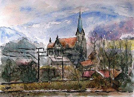 Na obrazie widzimy malowniczy, niewielki kościółek, który majestatycznie góruje nad okolicą. Zabudowania są otoczone delikatnymi pociągnięciami pędzla, co nadaje im lekkości i ulotności. Kolory to głównie stonowane odcienie zieleni, błękitów oraz ciepłych brązów, które współgrają z niebem, pełnym chmur przypominających watę cukrową. Kontury wydają się lekko rozmyte, co sprawia, że obraz ma w sobie coś z sielankowej impresji. Coś jak z magicznego snu. Atmosfera emanuje spokojem, jakby czas przystał na chwilę, by pozwolić nam się zgubić w tej idyllicznej scenerii. Jest w tym coś niezwykłego, a jednocześnie coś, co kojarzy się z dzieciństwem i beztroską zabawą. Artysta zastosował technikę akwareli, co dodaje pracy delikatności i eterycznych wibracji. Pędzel wydaje się płynąć po papierze, tworząc iluzję subtelnych mgiełek unoszących się w powietrzu. Wiesz, to takie soft and dreamy. Obraz może wywołać w odbiorcy uczucie nostalgii, pragnienie powrotu do miejsc, które pamiętamy z dawnych lat. Nasuwa mi się myśl, że miejsce to skrywa wiele tajemnic. Czy to miejsce istnieje naprawdę, czy to tylko wytwór wyobraźni? Jedno jest pewne — jest w tym coś niezwykle przyciągającego. Super. Patrząc na ten obraz, możemy poczuć nie tylko ciszę, lecz także echo starych melodii, które grają w naszych sercach.